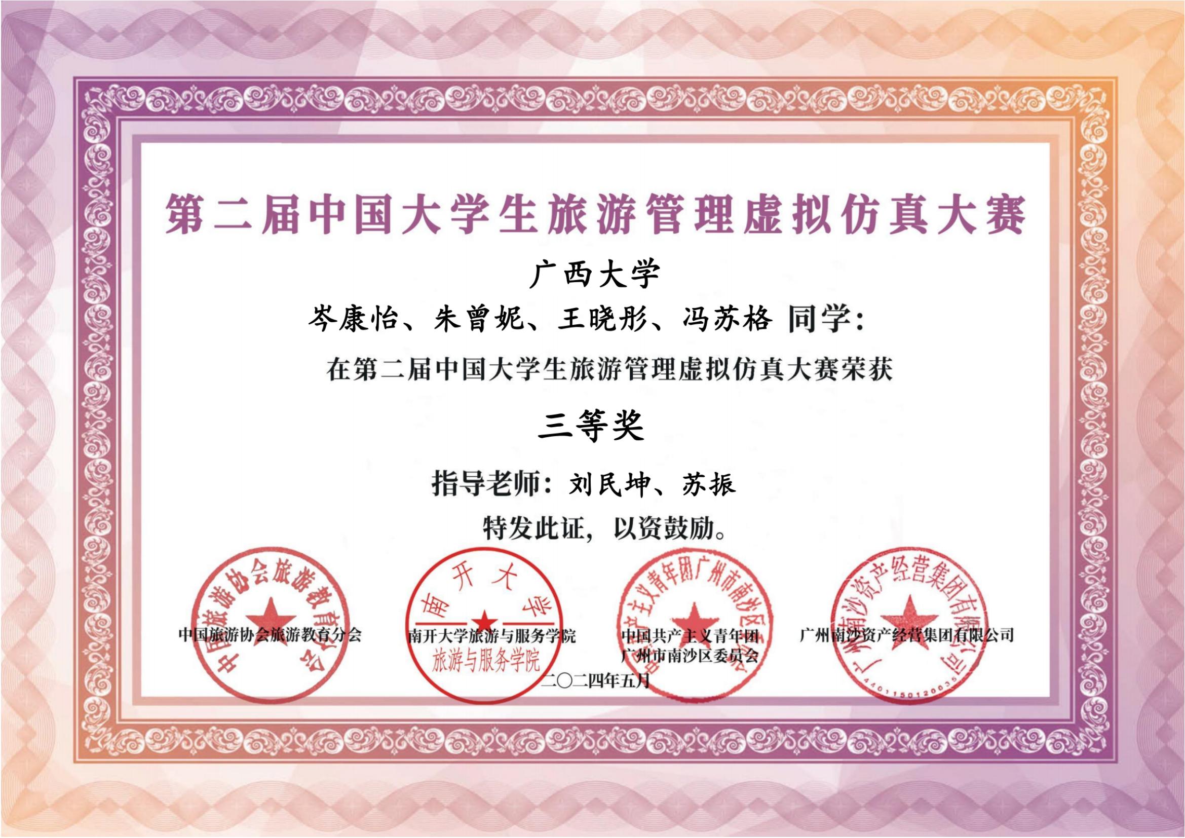 近日,由中国旅游协会旅游教育分会、南开大学旅游与服务学院等单位主办的第二届中国大学生旅游管理虚拟仿真大赛落下帷幕,bat365官网旅游管理专业2023级本科生(岑康怡,朱曾妮,冯苏格,王晓彤)组成的参赛队伍表现出色,荣获大赛三等奖。