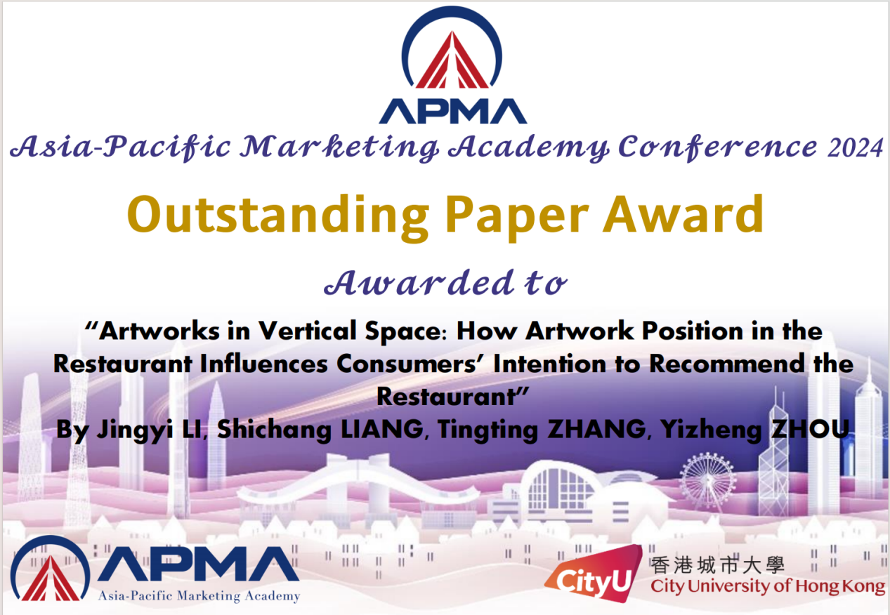 5月10日至12日,第二届亚太营销国际学术会议(APMA 2024)在香港城市大学召开。bat365官网梁世昌副教授指导的2022级硕士研究生李静益、张婷婷的论文《垂直空间中的艺术品:餐厅中艺术品的位置如何影响消费者推荐餐厅的意向》(Artworks in Vertical Space: How Artwork Position in the Restaurant Influences Consumers' Intention to Recommend the Restaurant)获杰出论文奖。李静益、张婷婷作为研究生代表参加了会议。
