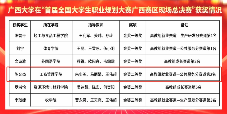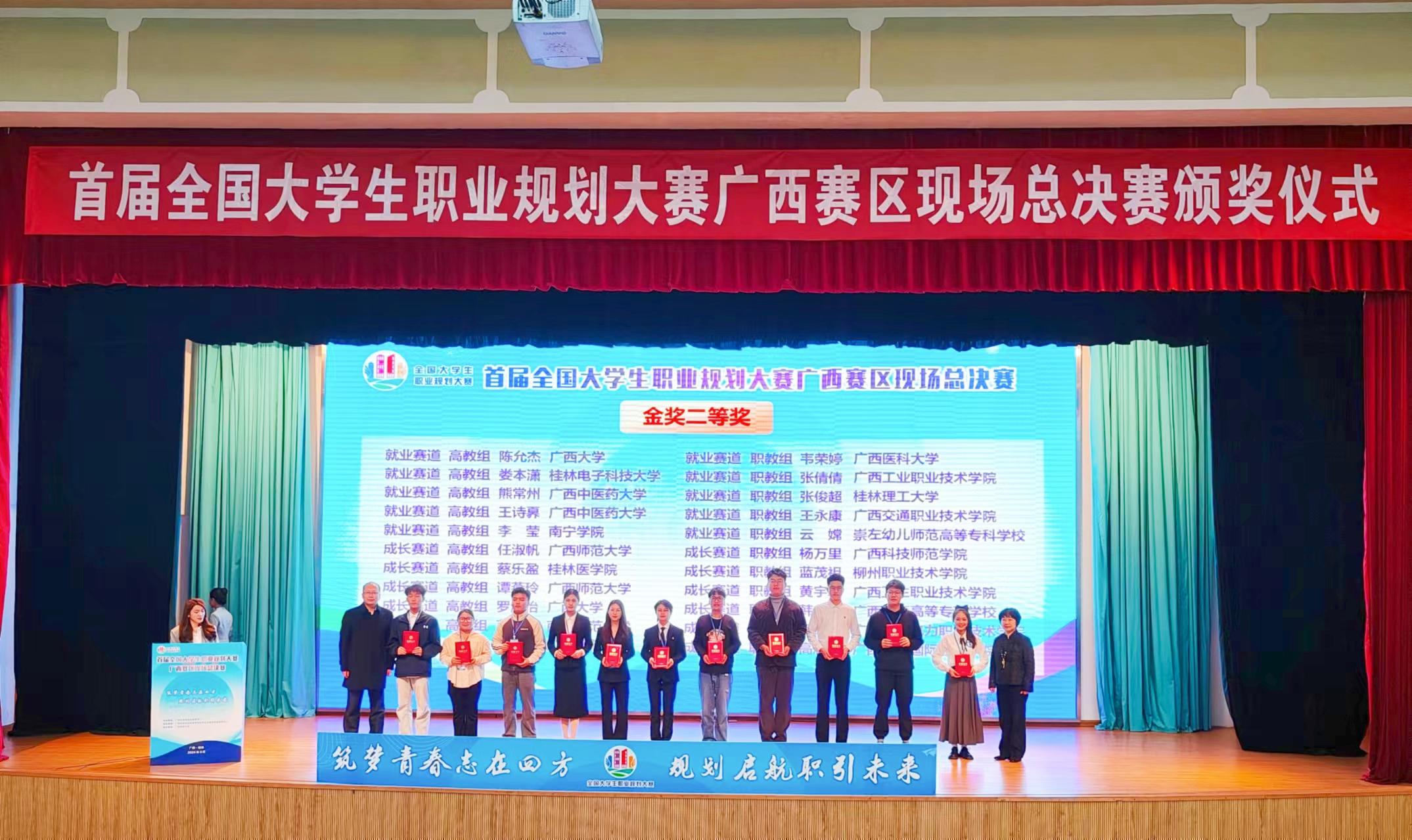 3月12日-13日,首届全国大学生职业规划大赛广西赛区现场总决赛在广西师范大学举行。bat365官网硕士研究生陈允杰参加比赛,并荣获就业赛道金奖二等奖。