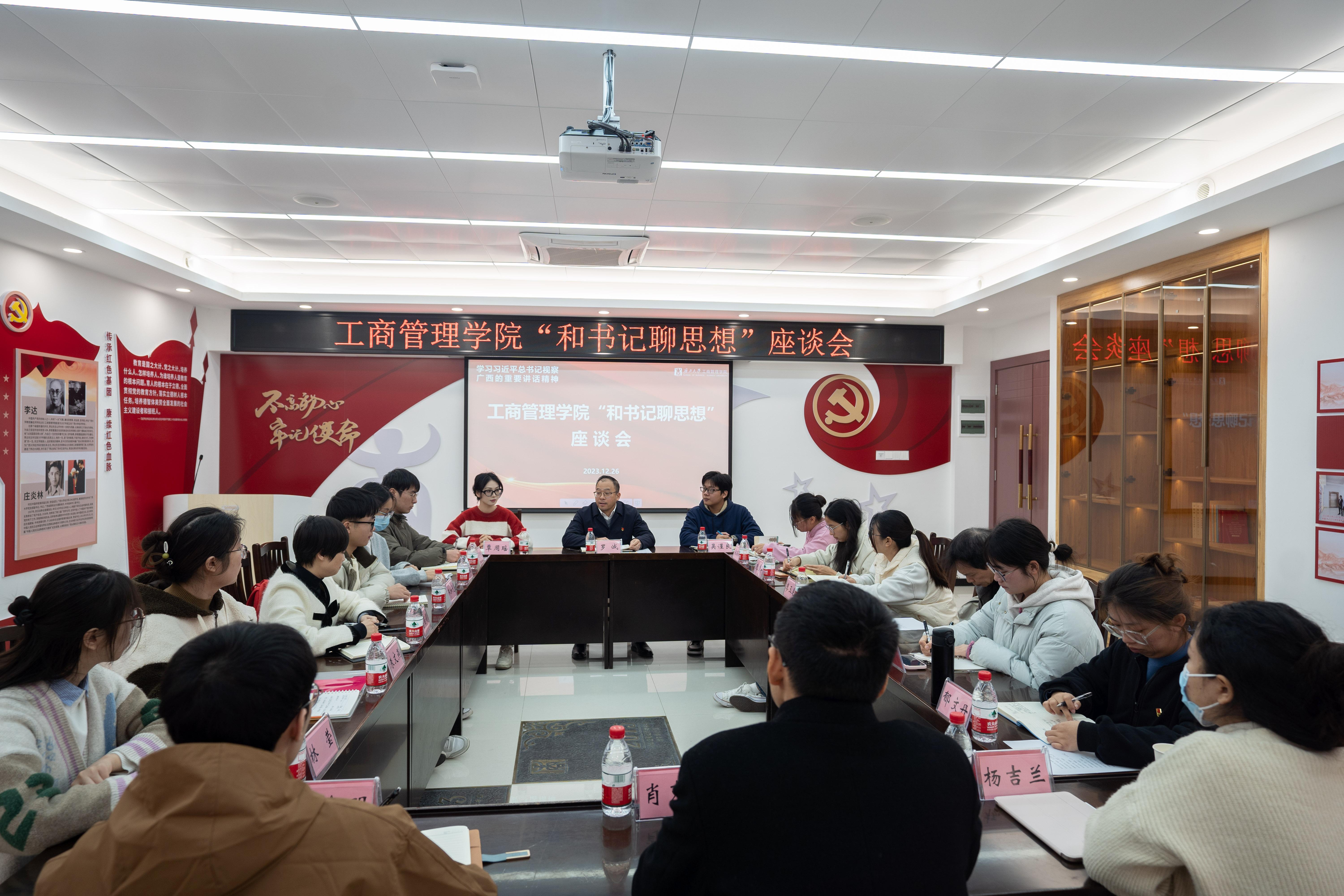 12月26日上午,bat365官网在党员活动室开展“和书记聊思想”活动,深入学习领会习近平总书记视察广西的重要讲话精神。学院党委书记罗诚与13名学生干部代表面对面交流,了解同学们的理论学习感悟、思想动态、日常学习生活等方面情况。学院党委副书记肖克宁、团委书记马丽娟、组织员黄照温、辅导员郁文丹参与活动。