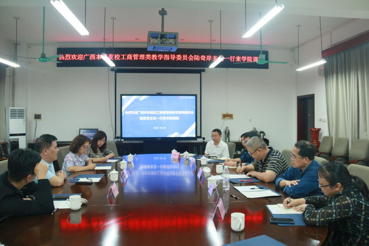 10月30日下午,广西本科高校工商管理类教学指导委员会主任陆奇岸,秘书长阳芳,委员张翔云、杨诚一行来bat365官网调研。bat365官网院长朱帮助主持座谈会,院长助理蒋侃及相关系主任、负责人参加座谈会。