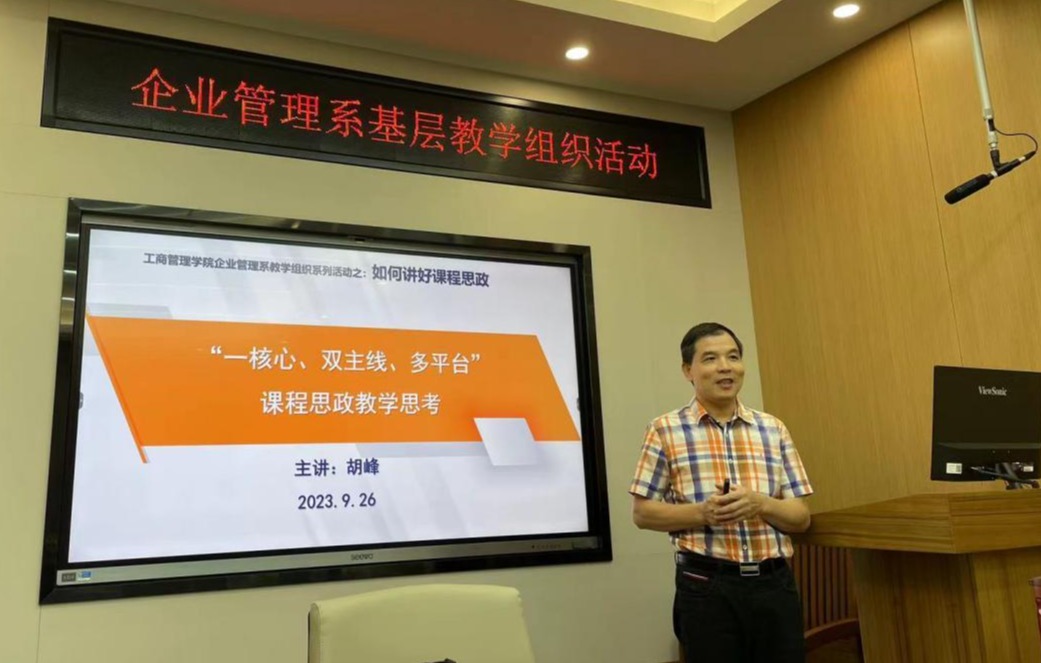 9月26日下午,企业管理系在学院232教室举行主题为“如何讲好思政课”的基层教学组织活动。活动上,胡峰老师和梁世昌老师分别以《“一核心、双主线、多平台”课程思政设计》和《科研思维推动课程思政教学》为题,结合自己所授课程和科研经历,以《人力资源管理》《创业学》《微观经济学》为例,给大家进行现场示范教学,演示如何将思政元素有机融入专业课程的教学中。