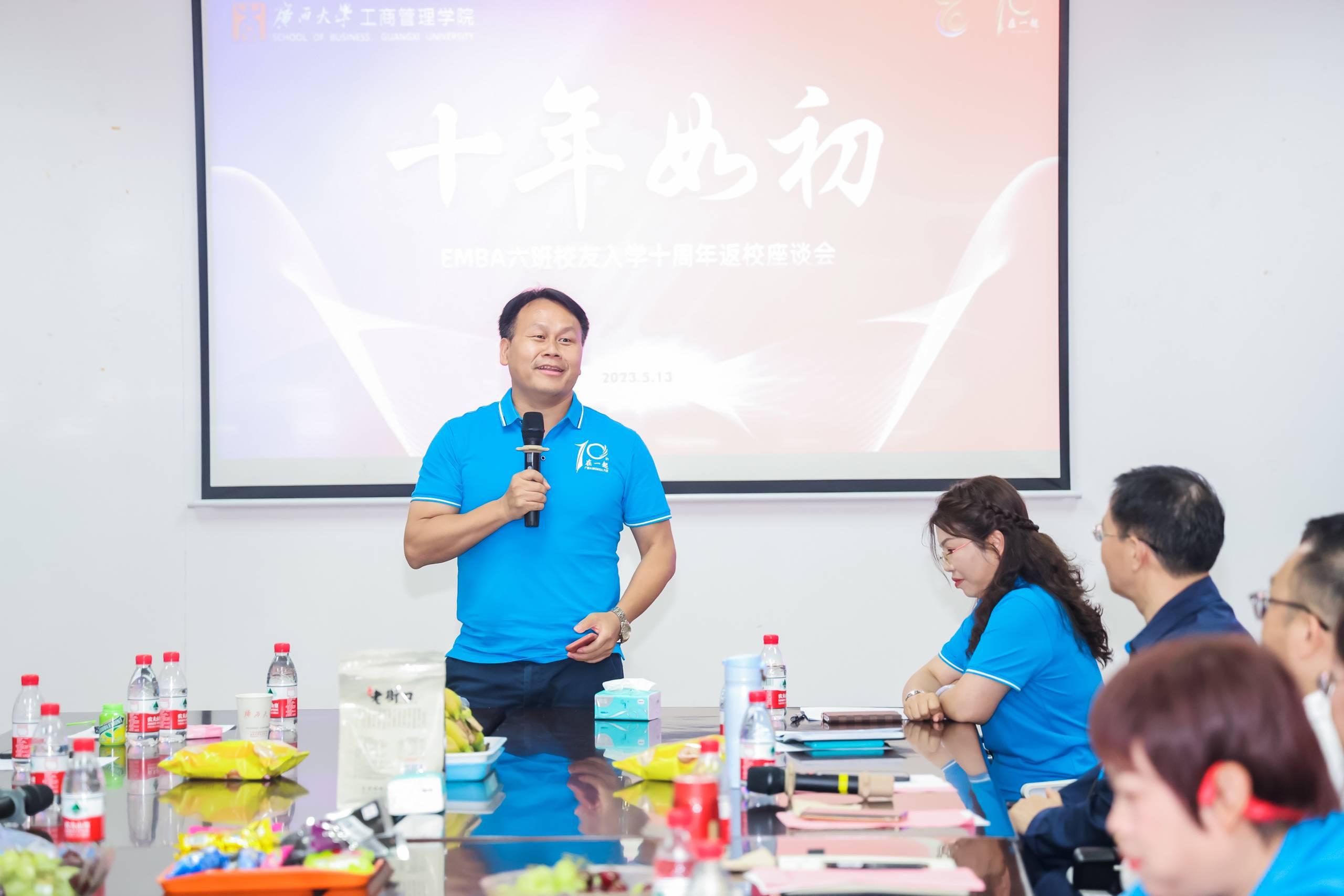 本次返校主题为“十年如初”。据悉,EMBA六班校友是在2012年的12月22日入学的,全班同学把班级精神定为“在一起”,在校学习阶段和毕业后举办了丰富多彩的活动很好地融汇和践行了这一宗旨。2022年是EMBA六班入学十周年,班级较早地成立了十周年筹备组,开展了动员和策划各项前期活动。但由于新冠疫情原因不得已延迟到了2023年。本次聚会全班有45名同学返校参加座谈会,占全班同学的70%。虽然毕业良久,校友们依旧激情澎湃,饱含感情。校友们为老师准备了鲜花表示敬意,回顾了在EMBA的学习初心和满满收获,分享了有笑有泪有爱有感动的十年同窗情。座谈会上,大家齐声合唱建班之初创作的歌曲《西大欢迎你》,共同观看了同学们电子相册“EMBA六班十年风采录”和同学们亲自出演的MV《曾经的你》,现场气氛热烈,掌声不断。最后,大家共同期待和拥抱下一个十年。