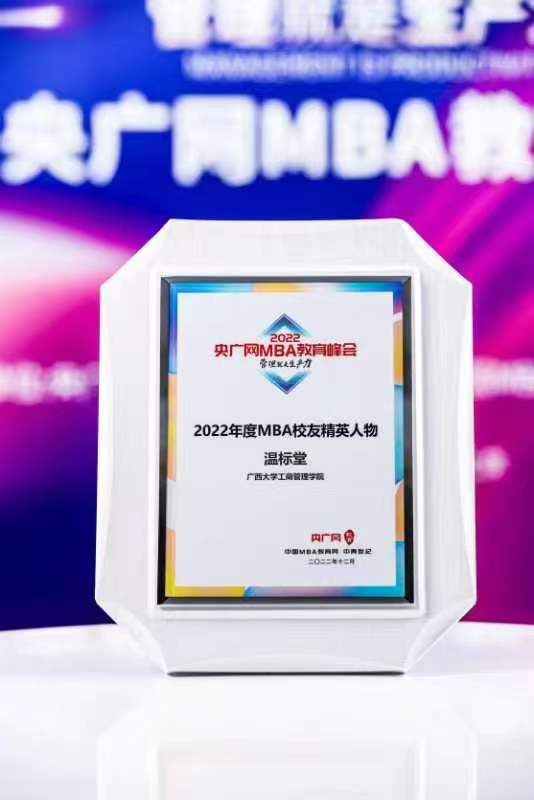 beat365官方网站校友温标堂肩负责任担当,富有激情热血,在时代发展中追波逐浪,在社会主义事业建设中大放异彩,荣获“2022年度MBA校友精英人物”荣誉。