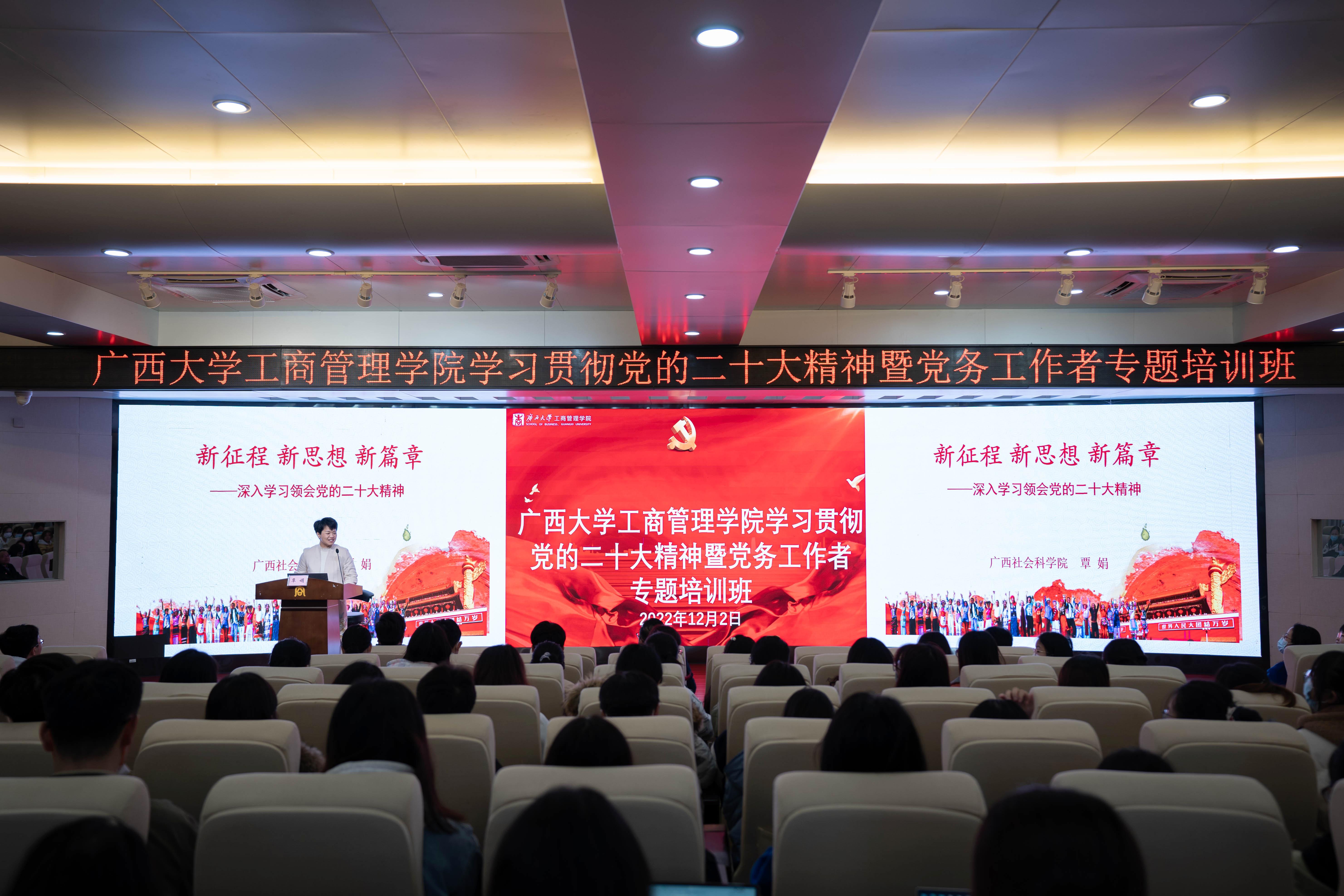 为帮助全院师生员工学习领会党的二十大精神,12月2日下午,自治区党委讲师团、区直机关工委讲师团聘任专家,广西社会科学院民族研究所所长、研究员覃娟受邀在学院128报告厅,为bat365官网党务工作者专题培训班学员作党的二十大精神宣讲报告。学院党委书记罗诚主持报告会。全院党务工作者、有关党员干部和师生到场聆听了报告。