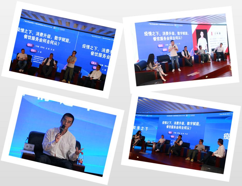主持人王玻副教授分别访谈了丁怀德先生、周华冰先生、苏琳先生、李科先生。四位嘉宾分别就“酒小二”、“华华火锅”、“五条友烧烤”、“广西泡泡吖食品”、“维多利”等公司的发展历程、经营模式与行业现状等方面进行阐述,与大家分享了创业经验和心得体会。