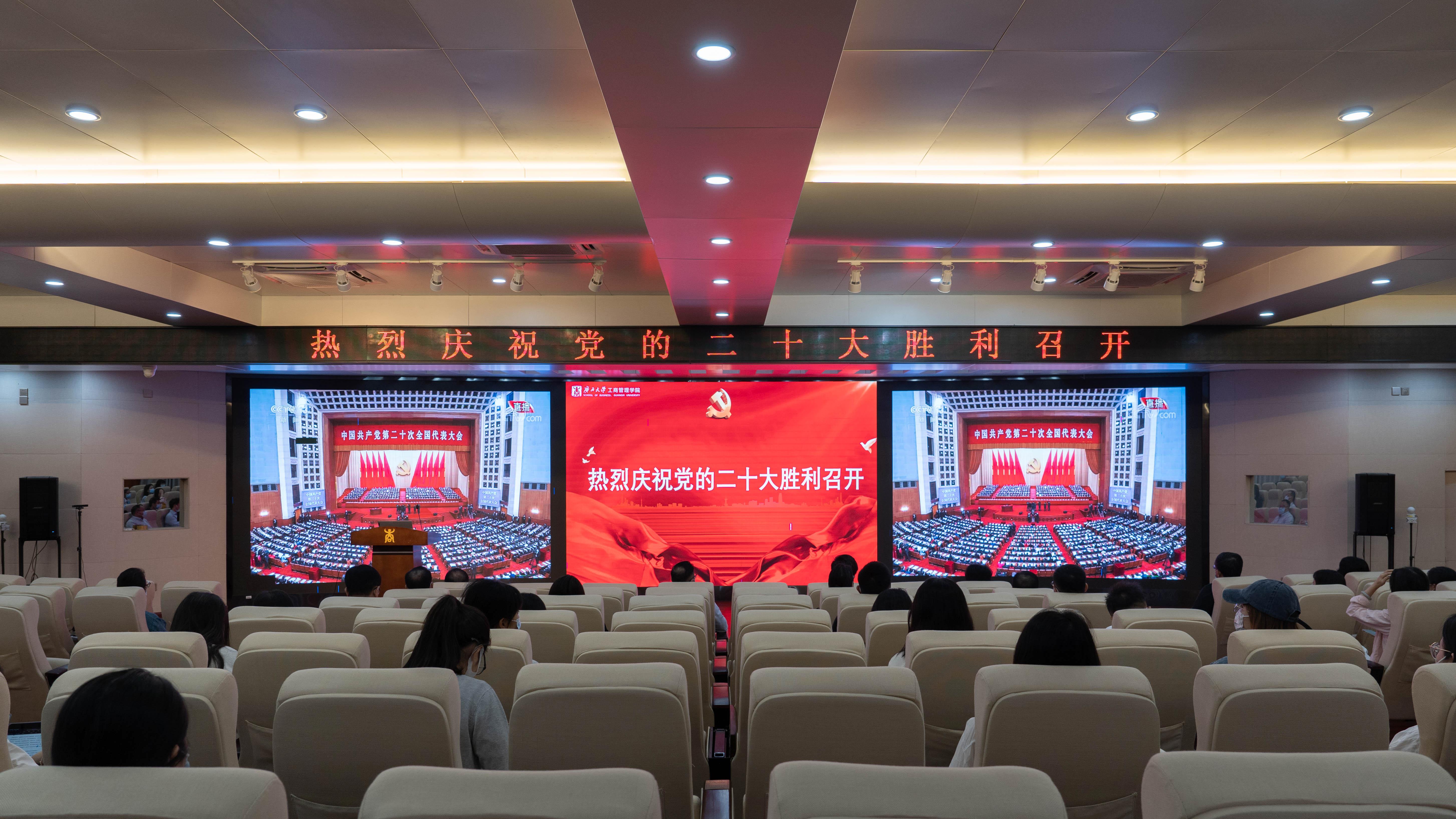 在beat365官方网站128报告厅、124教室,学院党员干部、师生代表集中收看开幕会盛况,其余师生自发在办公室、在寝室、在家等场所,通过电视、网络、广播等渠道认真收看收听党的二十大开幕盛况。
