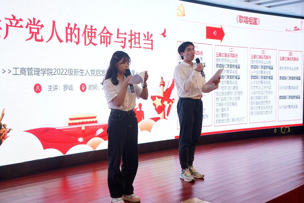 课堂上,为增强教学效果,抒发爱党爱国情怀,罗诚书记还邀请了学院学生艺术团的杨玉玲和何昊骞两位同学领唱、全体师生合唱《没有共产党就没有新中国》、《歌唱祖国》两首歌,希望同学们明白没有共产党就没有新中国,没有共产党就没有中华民族伟大复兴。在振奋激昂的歌声中,本次入党启发教育圆满结束。