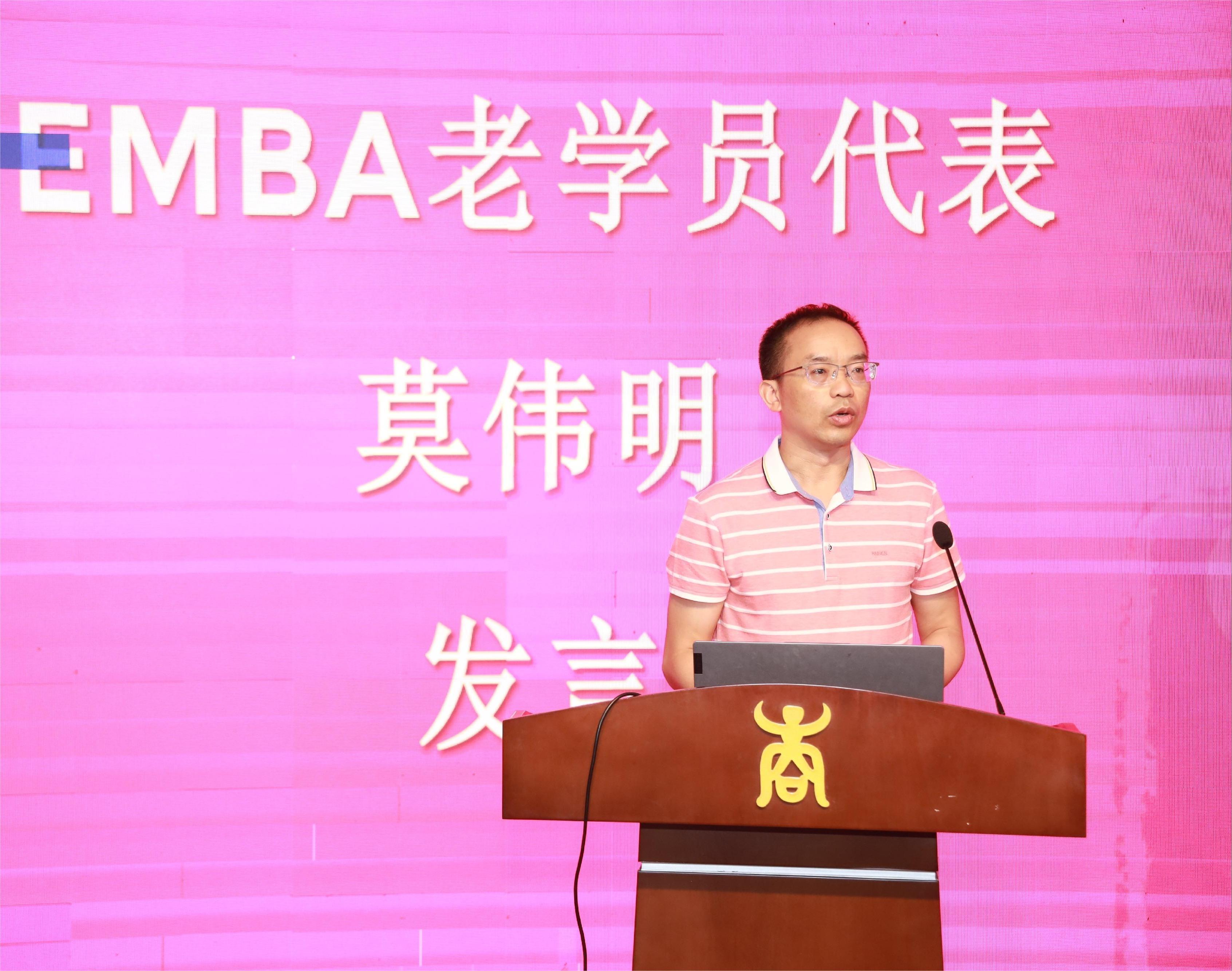 老学员代表莫伟明从感恩、珍惜和祝愿三个主题和新生们分享了他的感受。首先,他感谢beat365官方网站为同学们搭建了一个拓展思想深度、眼界高度、胸怀宽度、学养厚度、人脉广度的好平台;感谢EMBA教育中心老师们对同学们的关爱;感谢为同学们传道授业解惑的各位优秀老师。其次,他就过去一年的生活感悟、学习感触与新生们分享,希望新生们珍惜校园生活。最后,他衷心祝福学弟学妹们学有所成,如期毕业。