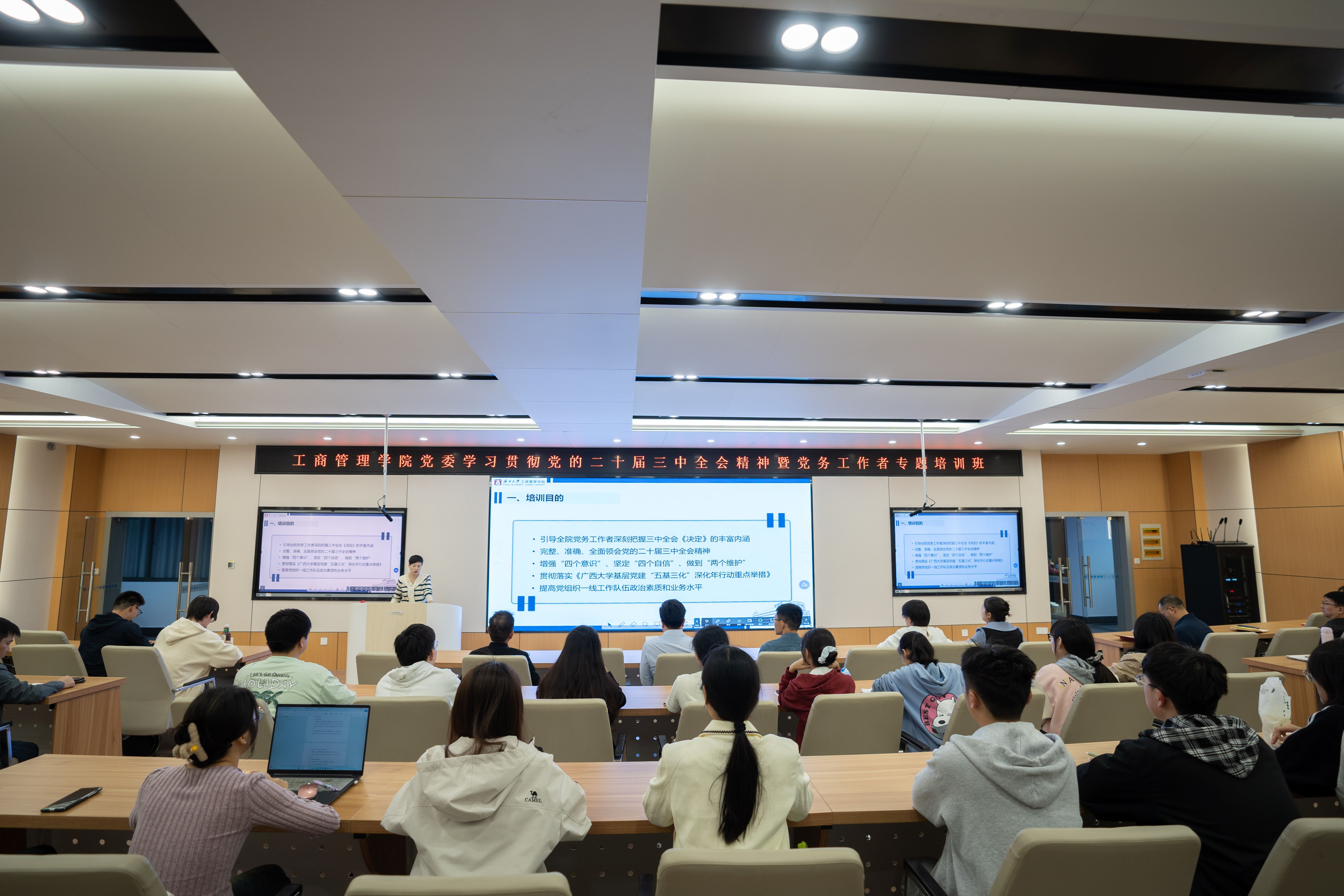 培训期间,党委书记黄晋以“学习贯彻党的二十届三中全会精神,开辟中国式现代化新前景”为题,围绕深刻学习领会进一步全面深化改革的主题、重大原则、重大举措和根本保证,进行了深入浅出的专题教学。学院党委副书记、纪委书记肖克宁从意识形态、学术诚信、科研经费、生活作风、行为规范等五大方面,对师生进行了廉政教育。党委组织员黄照温就党建业务进行培训,详细阐述了党员发展、组织生活、党员教育管理等关键环节的具体要求和操作流程。
