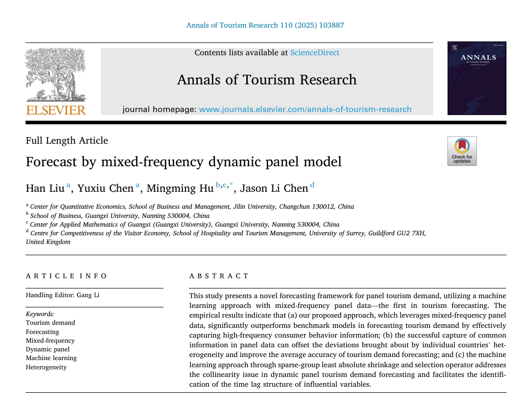 近日,bat365官网胡明明团队在旅游需求大数据混频预测领域取得新进展,构建了一个基于混合频率动态面板模型的旅游需求预测框架。相关成果以”Forecast by mixed-frequency dynamic panel model”为题,在旅游管理国际三大顶刊之一的《Annals of Tourism Research》上发表。