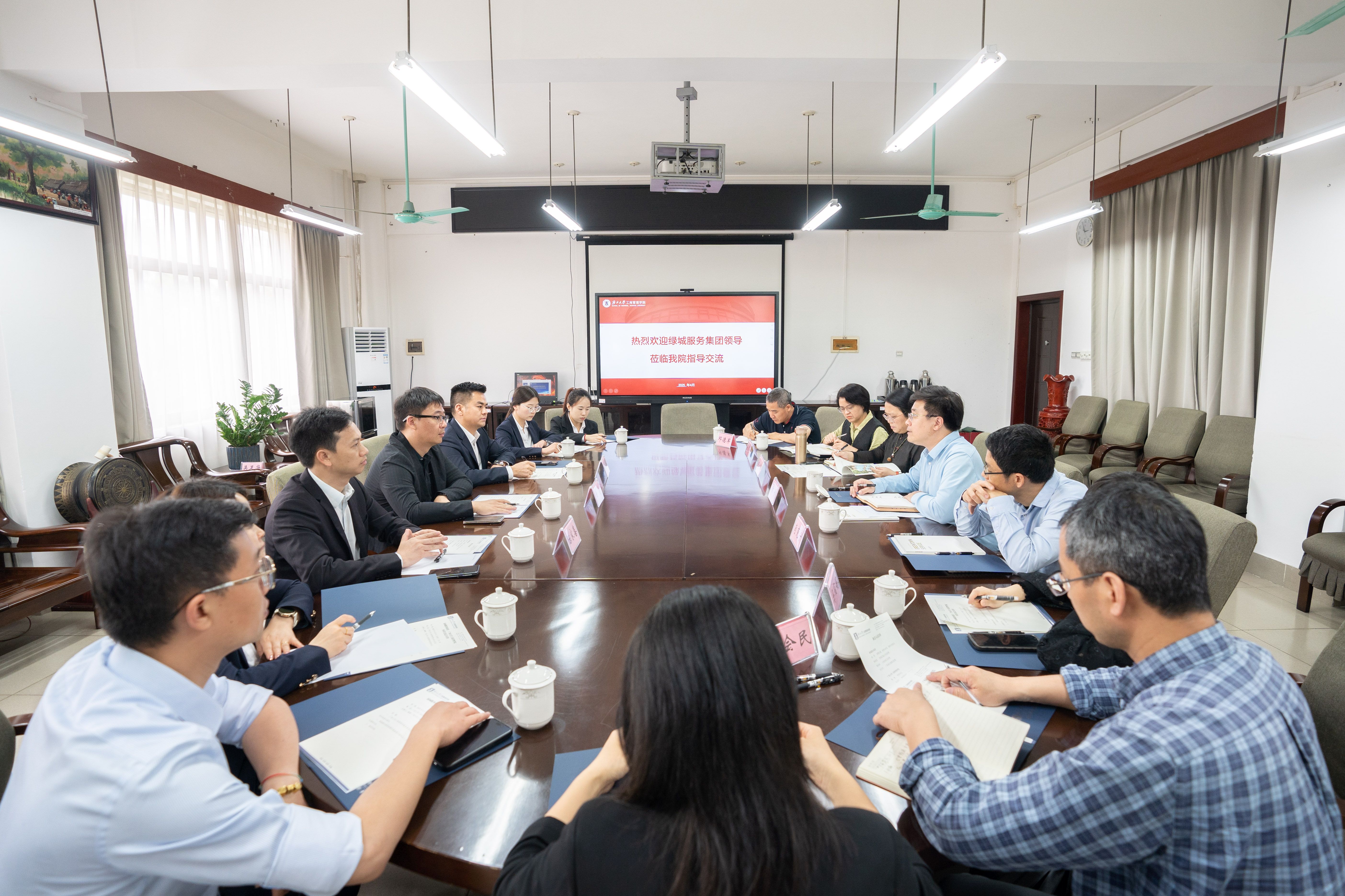 4月9日下午,绿城服务集团助理总裁、首席本体官、高校专班组长曲亮一行到bat365官网调研交流。学院党委书记黄晋,党委副书记肖克宁、副院长朱少英与来宾在420会议室座谈。