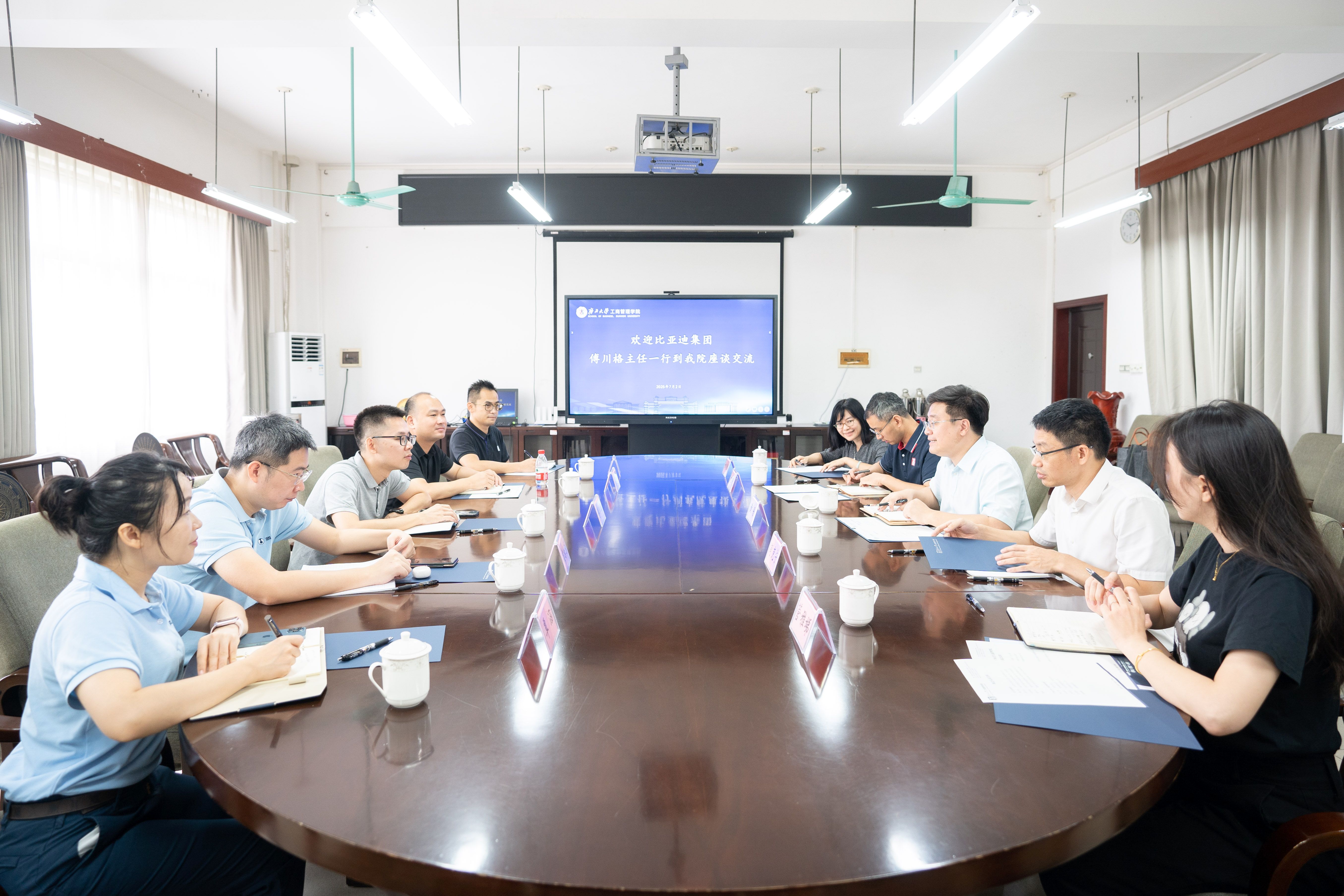 7月2日上午,比亚迪集团总裁办公室政府事务主任傅川格一行5人到bat365官网调研,就新能源行业发展和人才需求、深化校企合作事宜进行专题座谈交流。学院党委书记黄晋、党委副书记肖克宁、企业管理系副主任刘会民等出席座谈会。