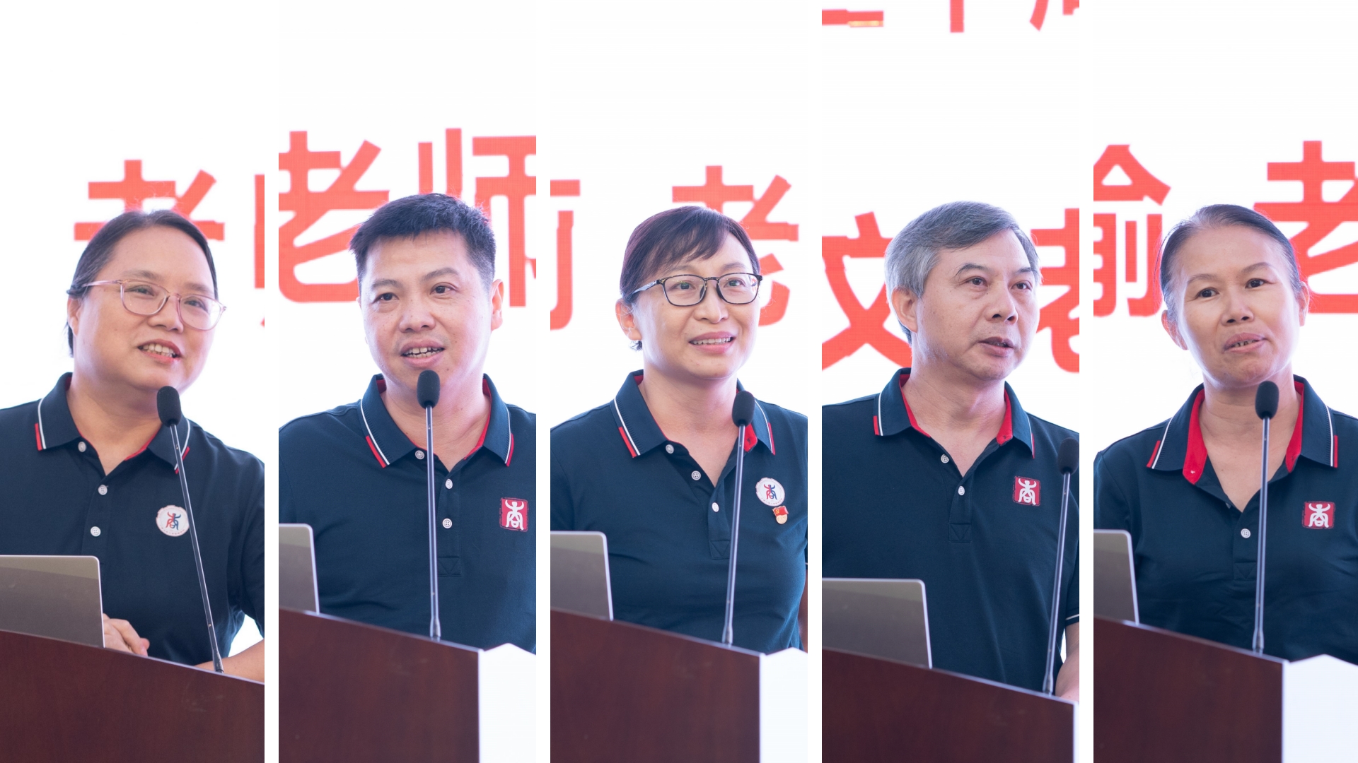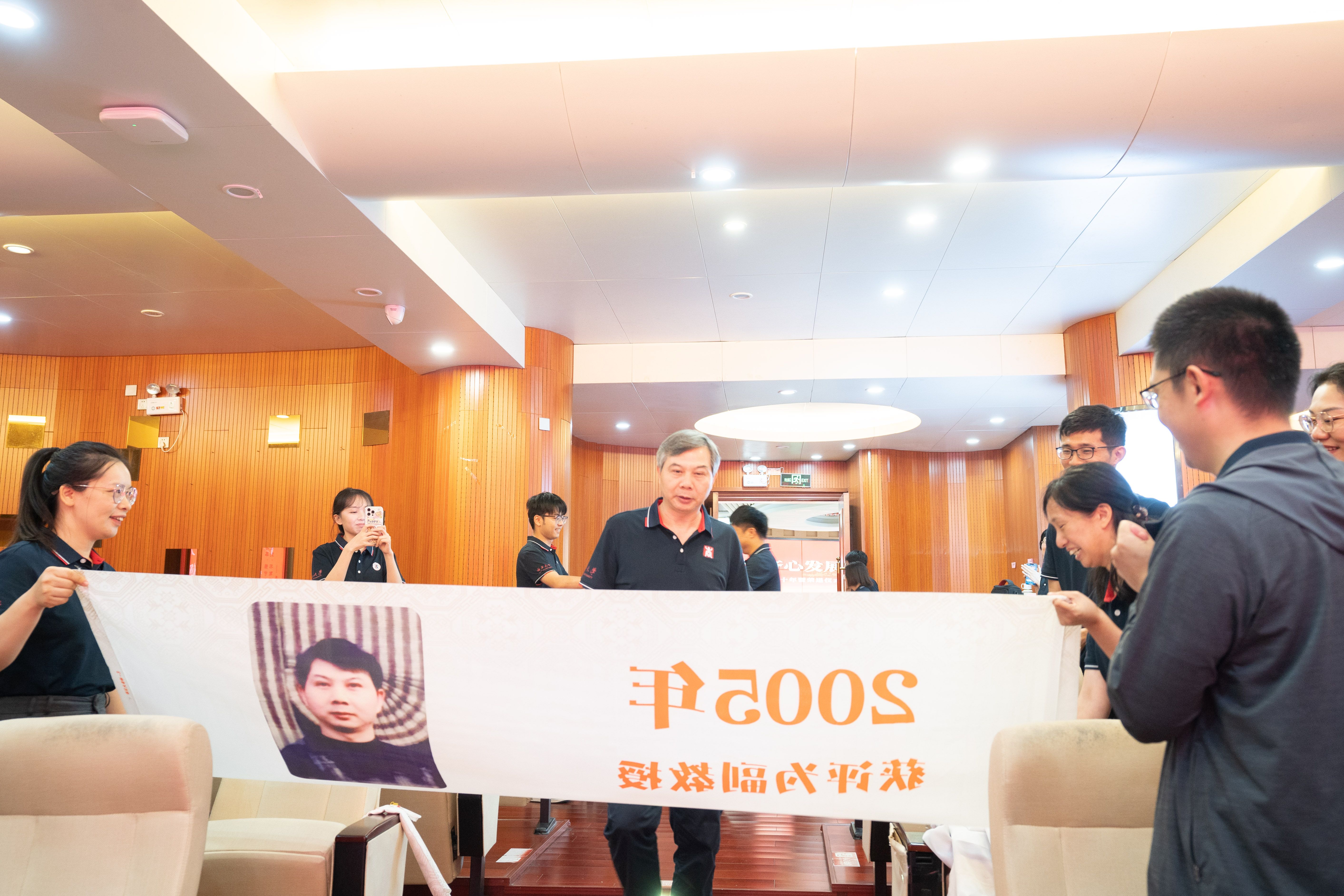 当朱少英、韦铁、滕莉莉、张星文四位从教三十年的老师和2025年荣退的潘思谕老师依次步入报告厅,现场迎来首个温情高潮。学院精心设计的五组纪念横幅沿通道徐徐展开,每幅横幅以时间轴形式呈现他们职业生涯的关键节点:从初登讲台的青涩岁月,到获评职称的重要时刻;从一名普通教师的平凡瞬间,到独当一面的专业负责人……这些珍贵的画面在横幅上一一展现,勾勒出最动人的“奉献长卷”,让在场的每一个人都能深刻感受到他们从教多年的坚守与付出。五位老师看着横幅上的自己,眼中闪烁着泪光,那是回忆的光芒,也是对教育事业深厚情感的流露。