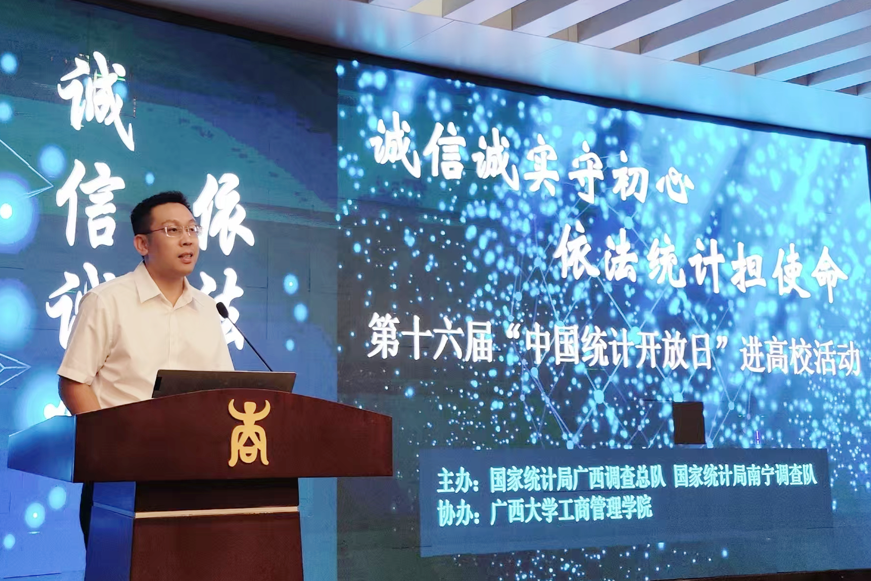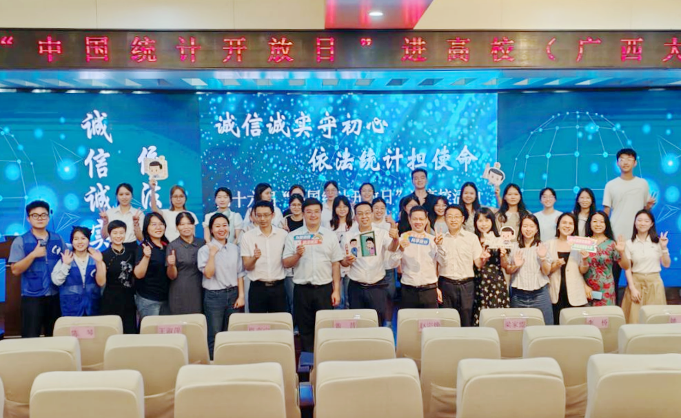 此次活动以“诚信诚实守初心 依法统计担使命”为主题,为高校师生搭建了解统计工作的平台,为建立理论教学与实践工作协同育人机制奠定基础。活动筹备精心,会场外LED大屏展示统计职业道德规范和南宁民生数据,主题展示台吸引师生打卡;会场内播放宣传动漫和视频,让师生入场前便沉浸于统计文化氛围中。