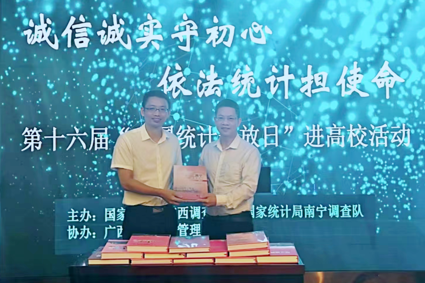 活动举行了赠书仪式,国家统计局南宁调查队党组成员、副队长梁家盟代表单位,向学院赠送2008-2024年《南宁调查年鉴》。这批涵盖17年南宁经济社会发展数据的年鉴,将为学院教学科研提供一手资料,成为资源共享、协同育人的重要载体,学院党委副书记肖克宁代表学院接受赠书。