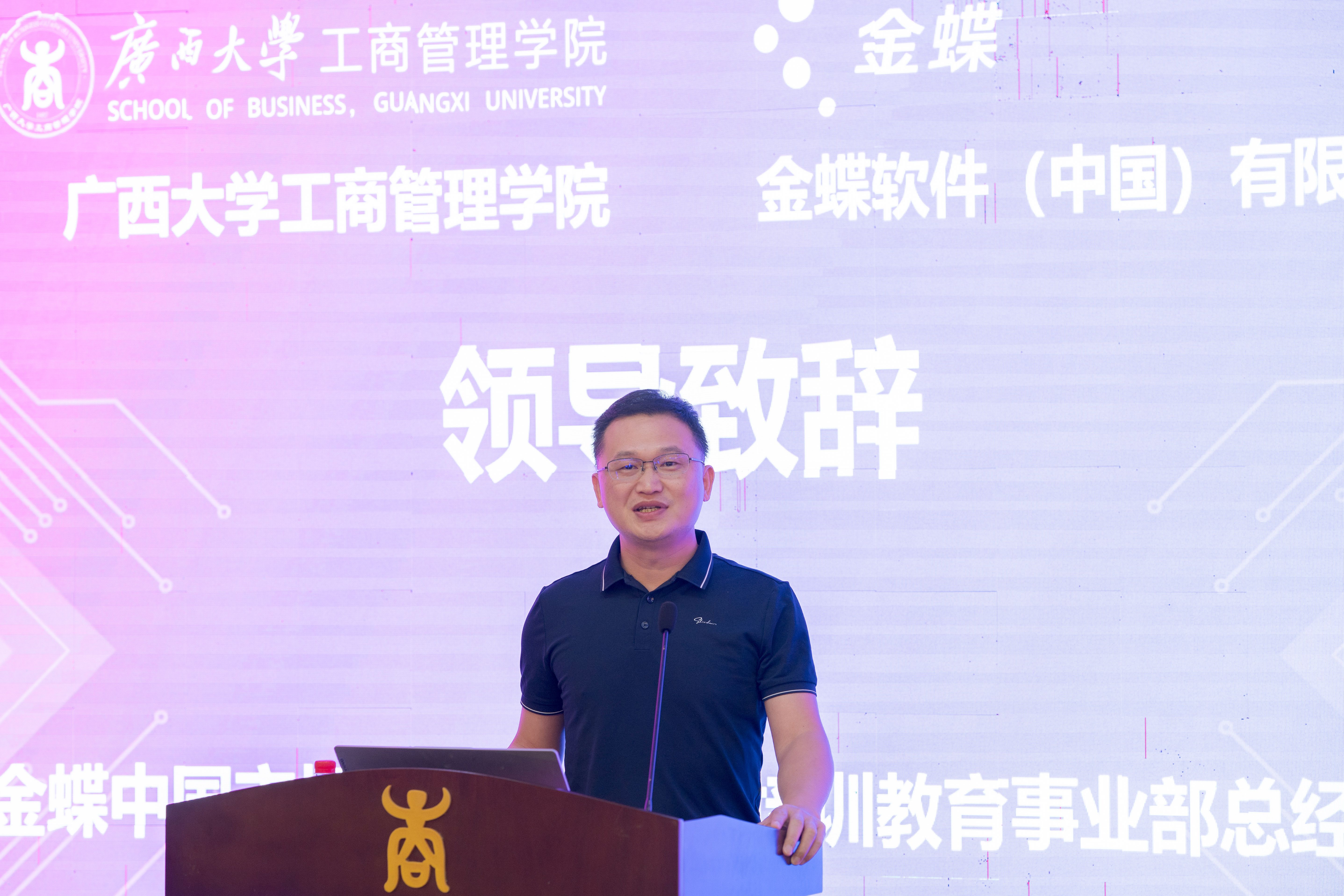 黄晋在致辞中指出,人工智能是引领新一轮科技革命与产业变革的核心驱动力,工商管理学科必须积极回应数智化趋势。学院将通过“人工智能+”人才培养模式,推动会计、市场营销、人力资源管理、旅游管理、供应链管理等多个专业与数字技术深度融合,着力培育具备数字素养和跨界整合能力的高素质管理人才。他强调,与金蝶共建人才培养基地,是学院推进学科数智化升级、深化产教融合的重要举措,期待双方在产教融合新范式、人才培养新体系和科研合作新路径等方面取得实效。