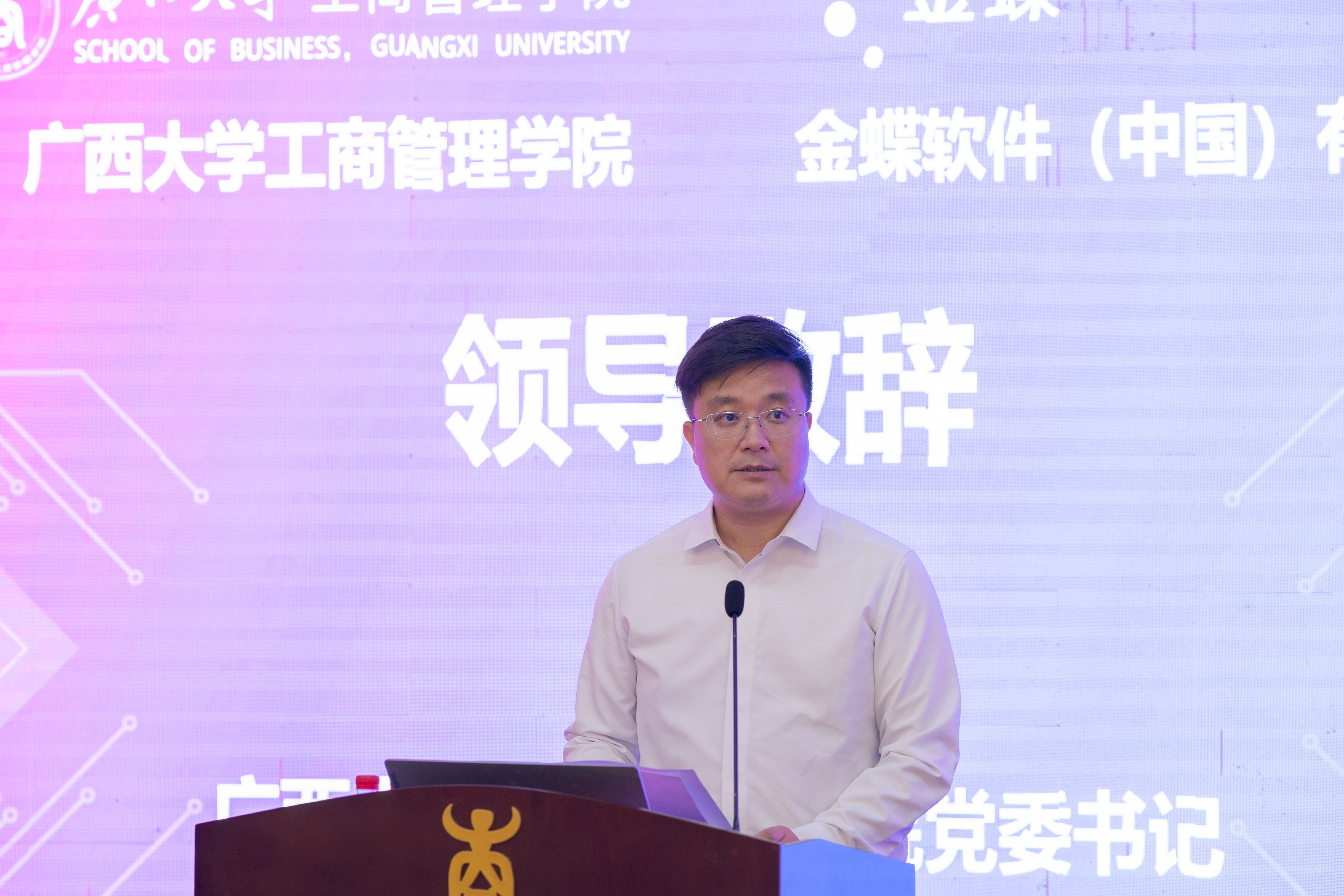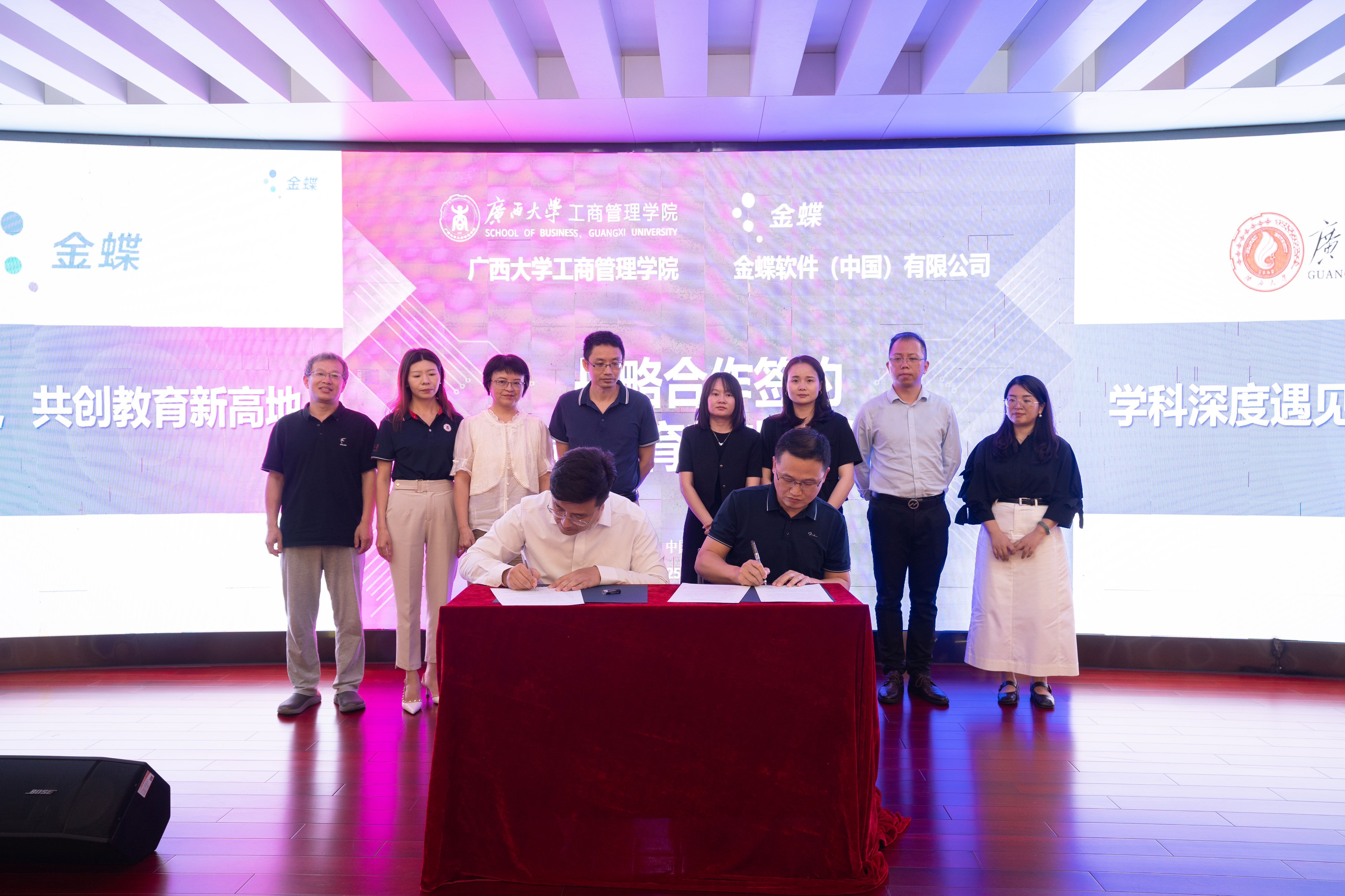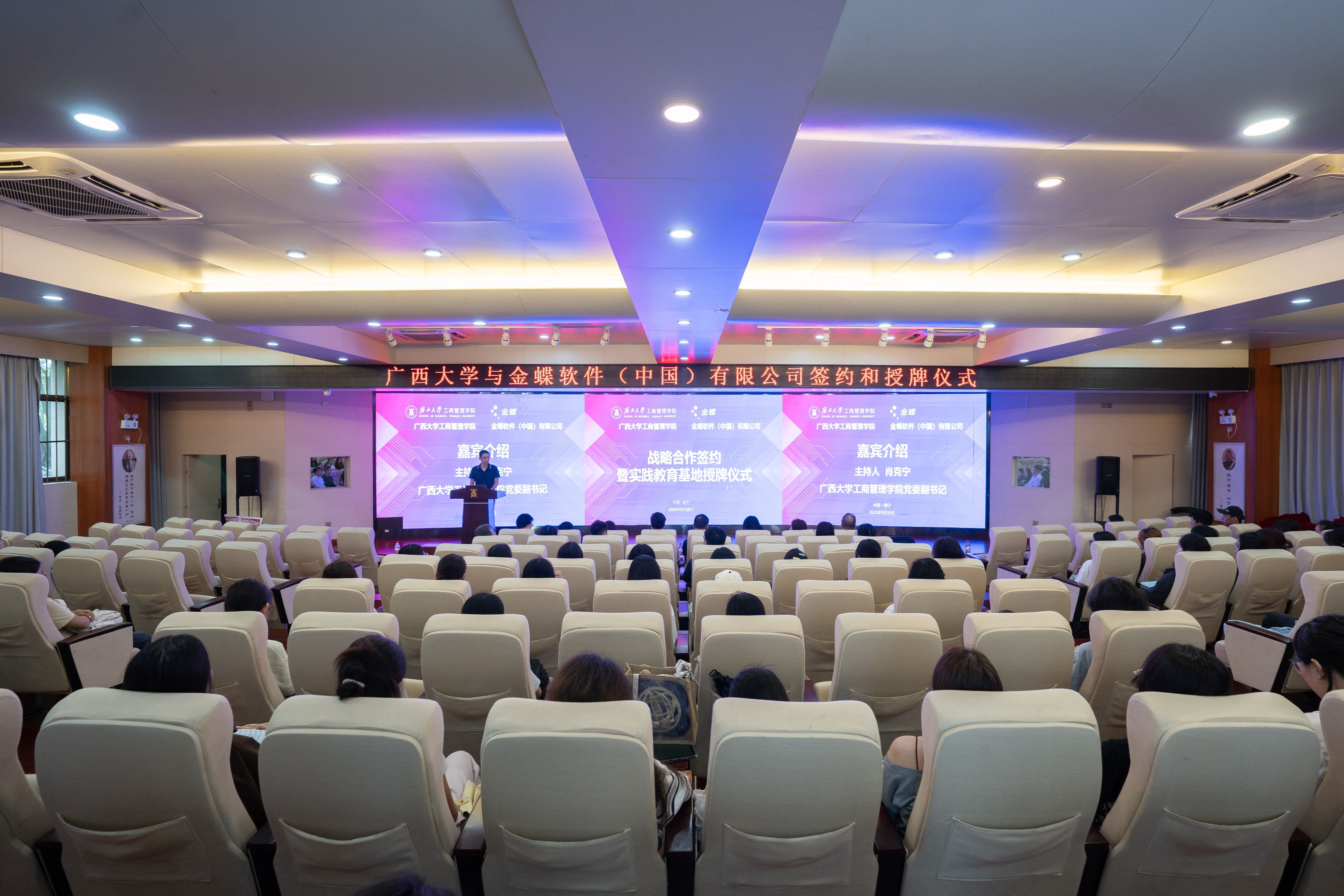 金蝶广西分公司市场部总监游阳、解决方案部高级顾问邓旭、院校业务经理韦晓春,beat365官方网站党委办主任、团委书记马丽娟,会计与财务金融系师生代表80余人参加了仪式。