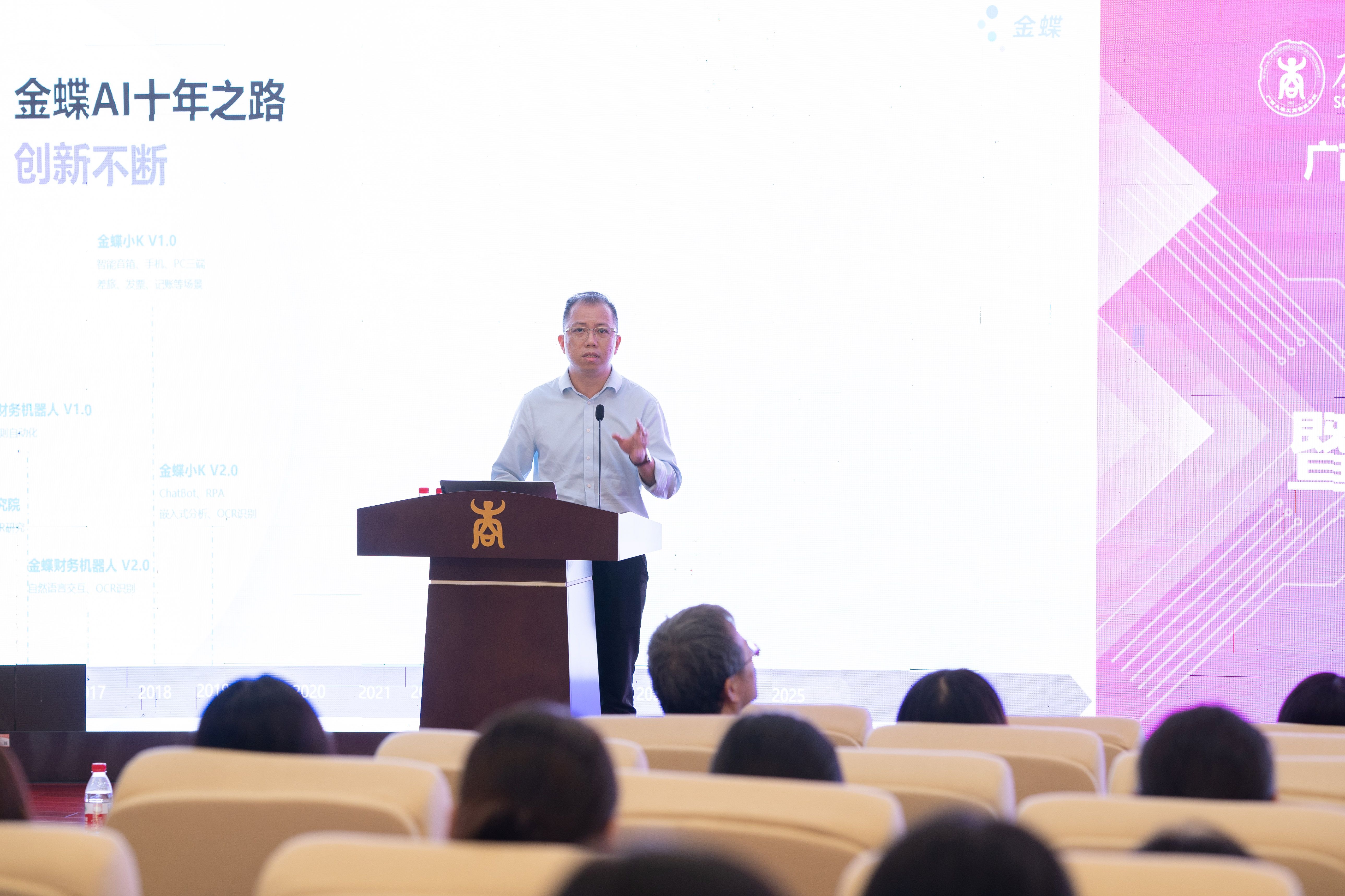 陈跃回顾了金蝶公司自1993年成立以来从财务软件到ERP、再到云服务与AI优先战略的演进历程。他表示,金蝶将依托自身在人工智能与企业数字化领域的深厚积累,与学院共同开展案例开发、课程建设、人才培养及跨境合作,助力学院实现“区域有品牌、国内有特色、国际有影响”的发展目标,赋能区域企业数字化转型升级。