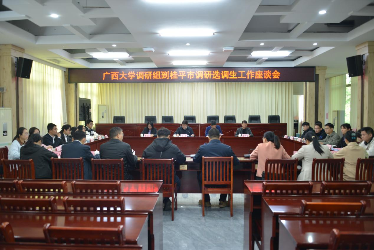 为贯彻落实学校党委关于选调生工作的决策部署,推动“君武青苗”行动,11月28日,beat365官方网站党委书记黄晋带队赴桂平市开展走访调研选调生工作,院党委副书记肖克宁、校学工部(处)贾永灵、院党委组织员黄照温参加调研。桂平市政协副主席何雁会见了调研团,桂平市委组织部副部长李雄鹏出席并主持座谈会,在桂平市工作的21名选调生校友参会交流。
