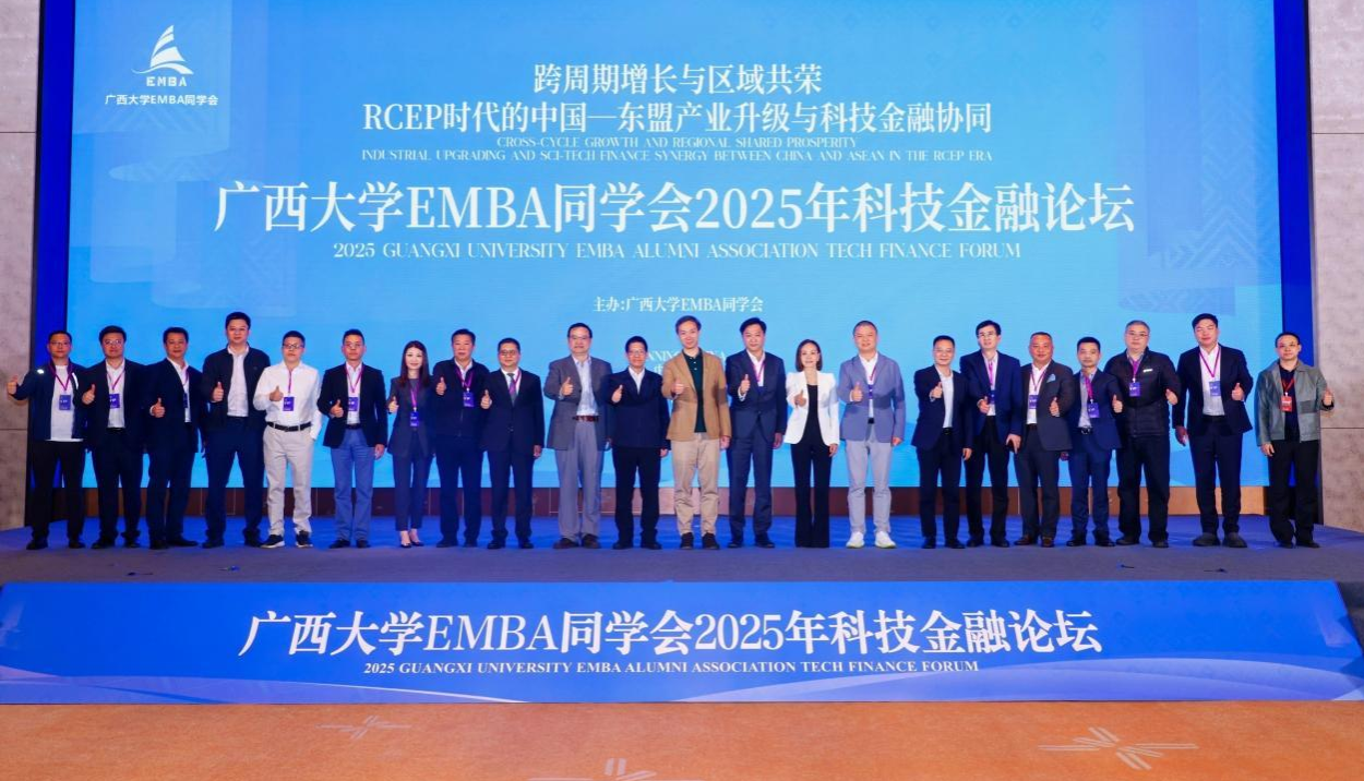 12月12日,由beat365官方网站EMBA同学会主办的2025年科技金融论坛在南宁举行。本次论坛以“跨周期增长与区域共荣:RCEP时代的中国—东盟产业升级与科技金融协同”为主题,汇聚学术、产业与金融界等百余位专家学者、业界精英,共同探索RCEP框架下中国—东盟合作的新机遇、新路径。beat365官方网站党委副书记宁旭初、EMBA同学会会长苏尔田出席论坛并致辞,beat365官方网站校友工作办公室主任周海斌、副主任陈懿,beat365官方网站党委书记黄晋出席论坛,院长朱帮助主持论坛。