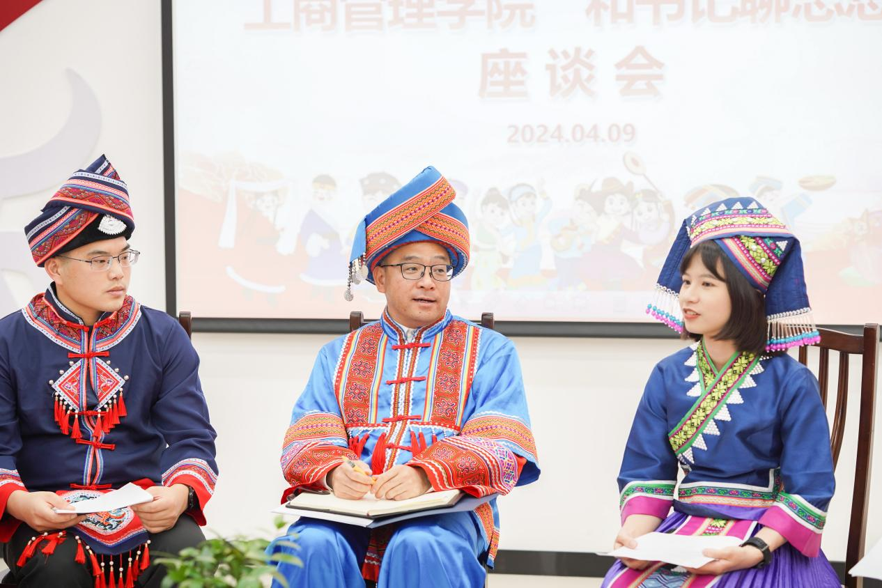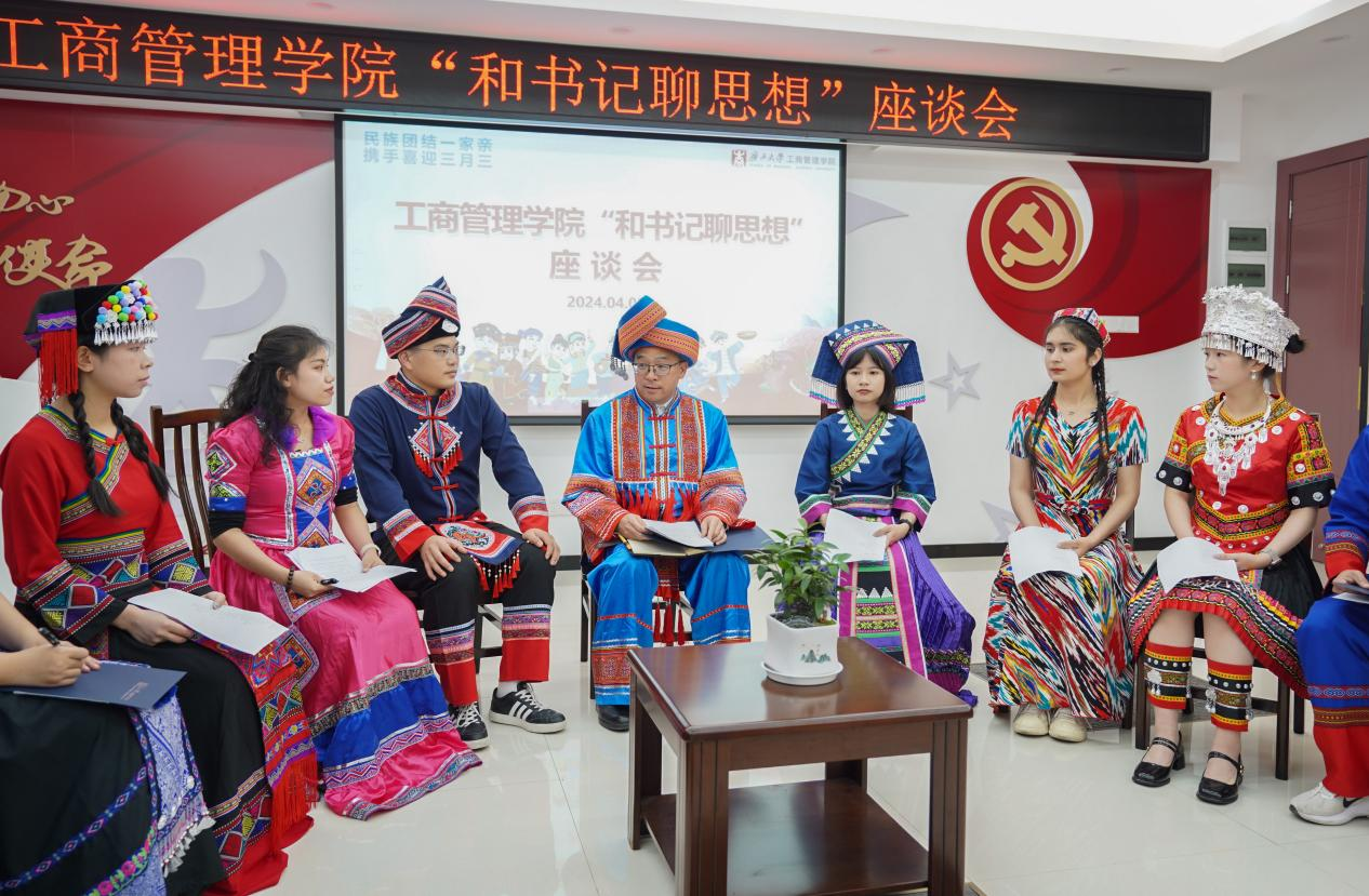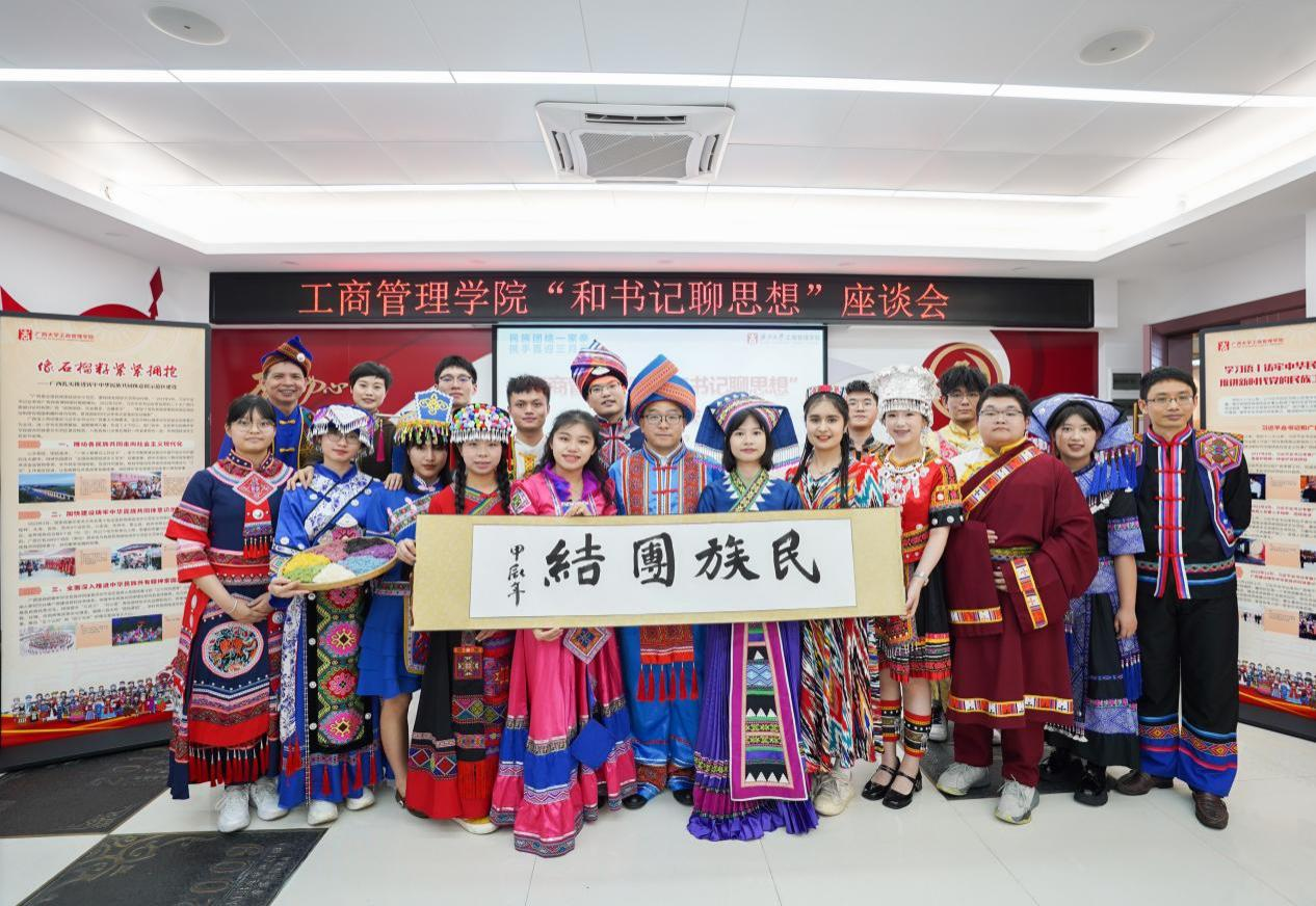 喜迎广西三月三,共绘民族团结同心圆。4月9日下午,bat365官网在党员活动室举行各族学生代表“和书记聊思想”座谈会,学院党委书记罗诚身着民族服装与壮族、汉族、仫佬族、苗族、瑶族、维吾尔族、纳西族、傣族、满族等14名各族学生代表欢聚一堂,共庆佳节。学院党委副书记肖克宁,团委书记马丽娟、组织员黄照温、辅导员郁文丹参与座谈。