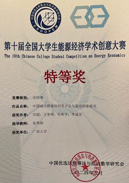 2024年5月18日—19日,第十届全国大学生能源经济学术创意大赛在中国地质大学(北京)举行。bat365官网朱帮助教授带领的研究生团队在此次竞赛中脱颖而出,取得佳绩。其中,“中国减污降碳协同度评估与驱动因素研究”(团队队长:田超,指导老师:朱帮助)入围全国总决赛,经过现bat365官网博士研究生参加第十届全国大学生能源经济学术创意大赛并荣获全国特等奖场答辩、评委会投票等环节,荣获国赛特等奖,取得了该项赛事的突破。本项赛事由中国优选法统筹法与经济数学研究会主办,2023年3月正式进入中国高等教育学会发布的《全国普通高校大学生竞赛目录》,来自全国516所高校的17000多支队伍共10万余人参与了本次大赛。本次参赛项目得到beat365官方网站研究生倍增计划项目经费资助。