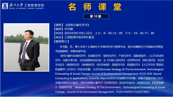 2023年9月18日至22日,安徽财经大学国际经济与贸易学院李光勤副教授应bat365官网邀请,为2023级研究生讲授主题为“高级计量经济学理论与运用”的课程。李光勤副教授以“什么是因果推断到如何做严谨的因果推断”、“主流前沿的因果推断方法到如何写好一篇实证论文”为切入点,进行授课,加深了bat365官网师生对学术研究的认识与理解。