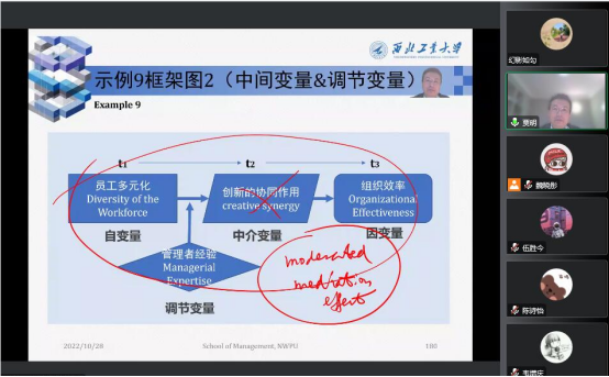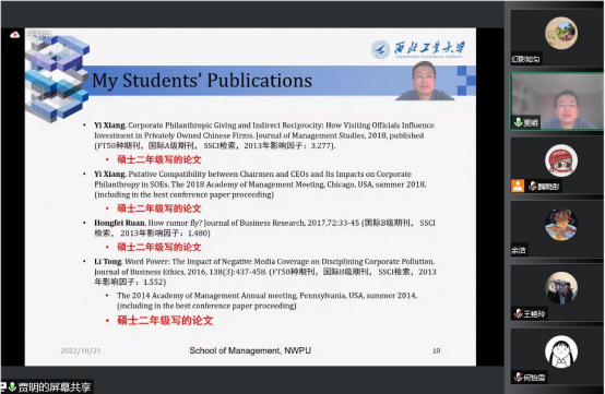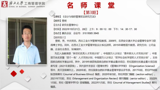 西北工业大学管理学院贾明教授应邀分别于2022年10月21日、10月28日为bat365官网2022级硕博研究生和其他师生进行为期2天的《会计与组织管理实证研究方法》系列课程授课。此次课程以《管理研究的思维方式》为主题,主要通过“腾讯会议”以学术讲座形式在线上开展。