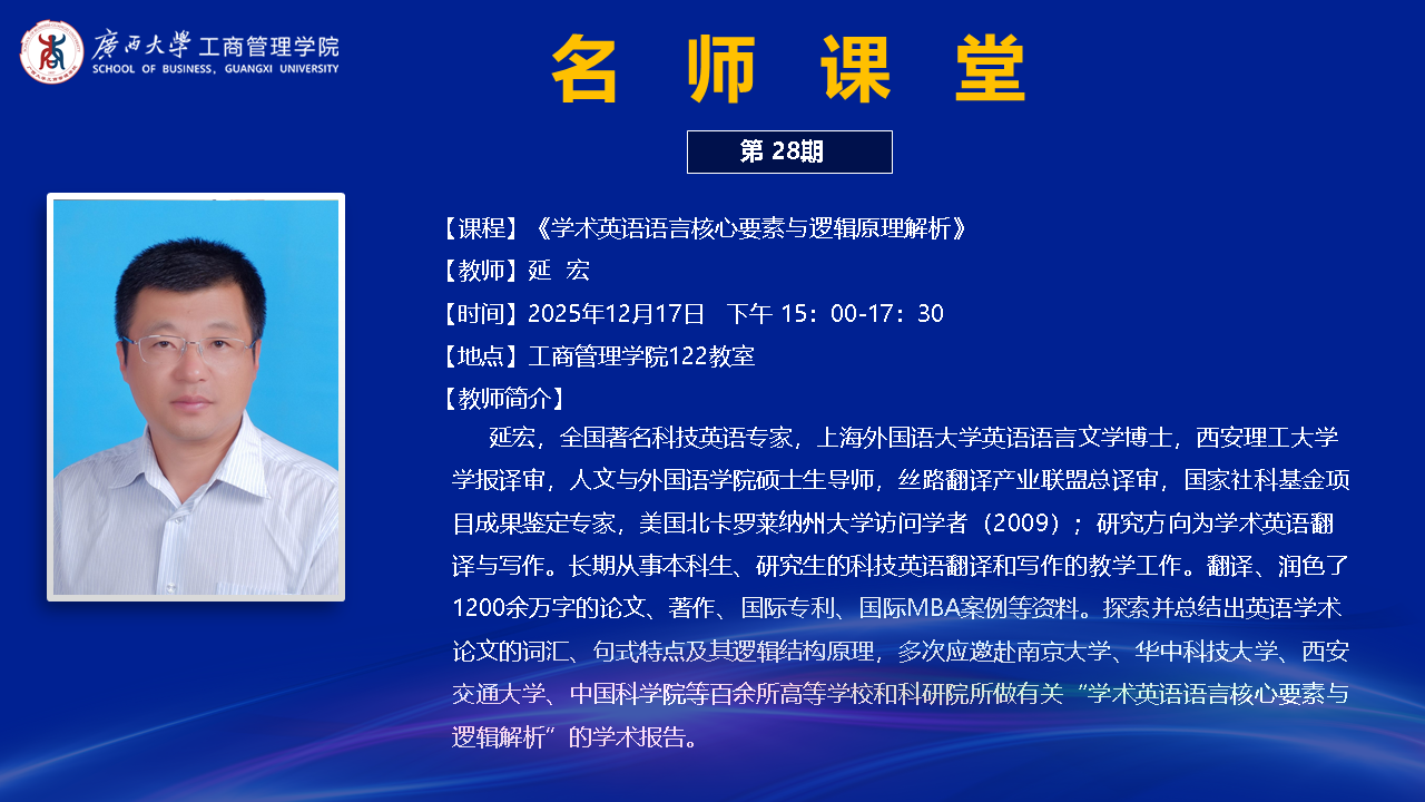 2025年12月17日下午,西安理工大学延宏教授应bat365官网邀请,针对国际重要期刊论文写作中的学术语言使用特点与规范,在beat365官方网站122教室为bat365官网师生带来一场题为《学术英语语言核心要素与逻辑原理解析》的专题讲座。