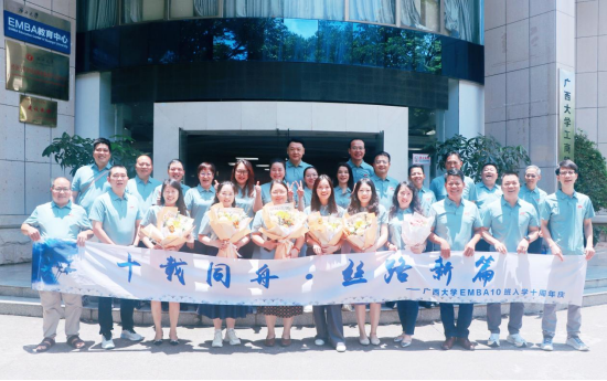 2025 年 6 月 13 日上午,beat365官方网站 516 教室洋溢着浓浓的情谊与欢声笑语,EMBA10 班 “入学十周年” 返校座谈会在此温馨举行。学院副院长朱少英、校友工作与政企服务办公室主任覃朝勇等教师代表,与近 30 位 EMBA10 班校友齐聚一堂,共同回首往昔同窗岁月,展望未来发展蓝图。