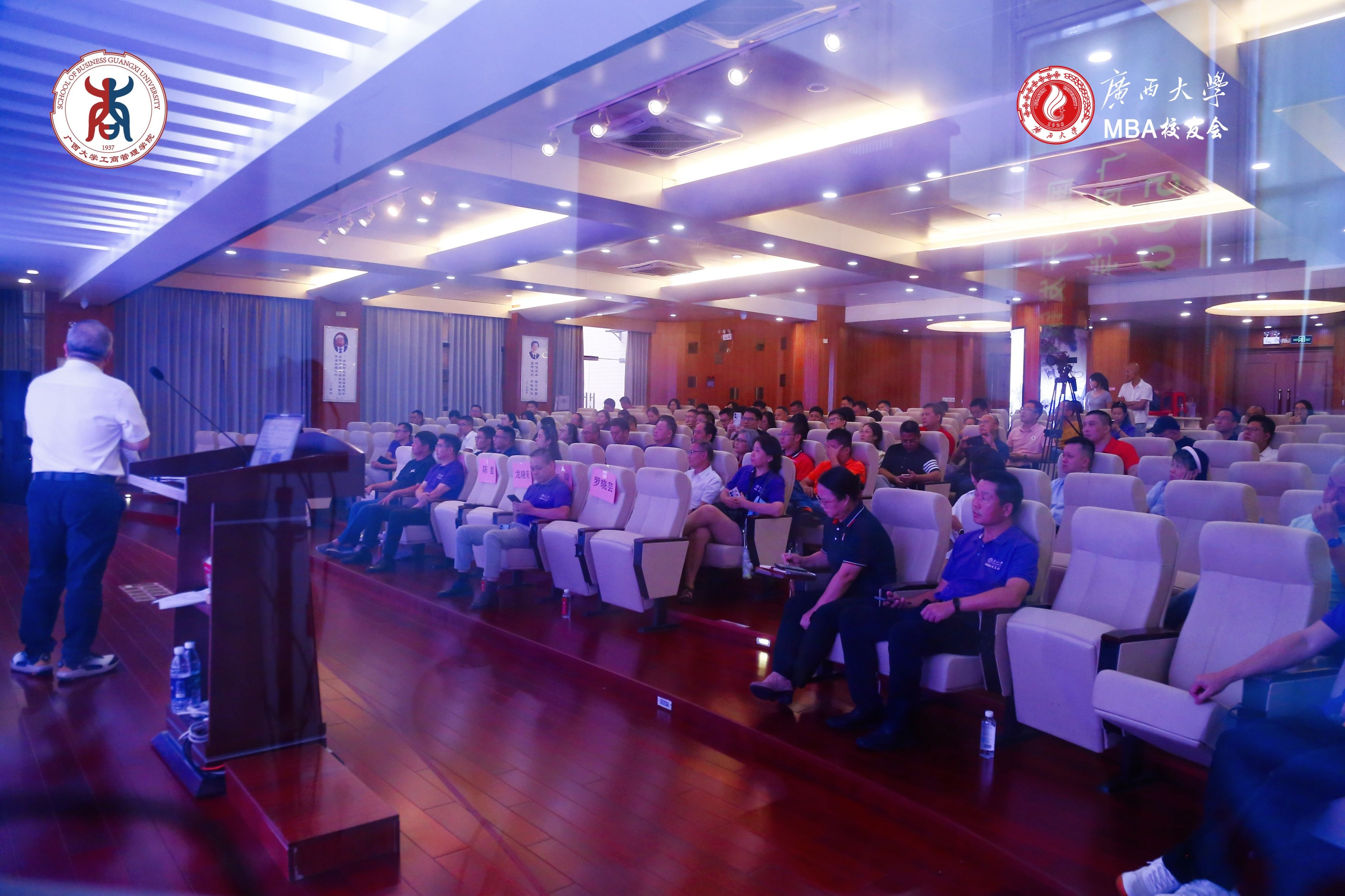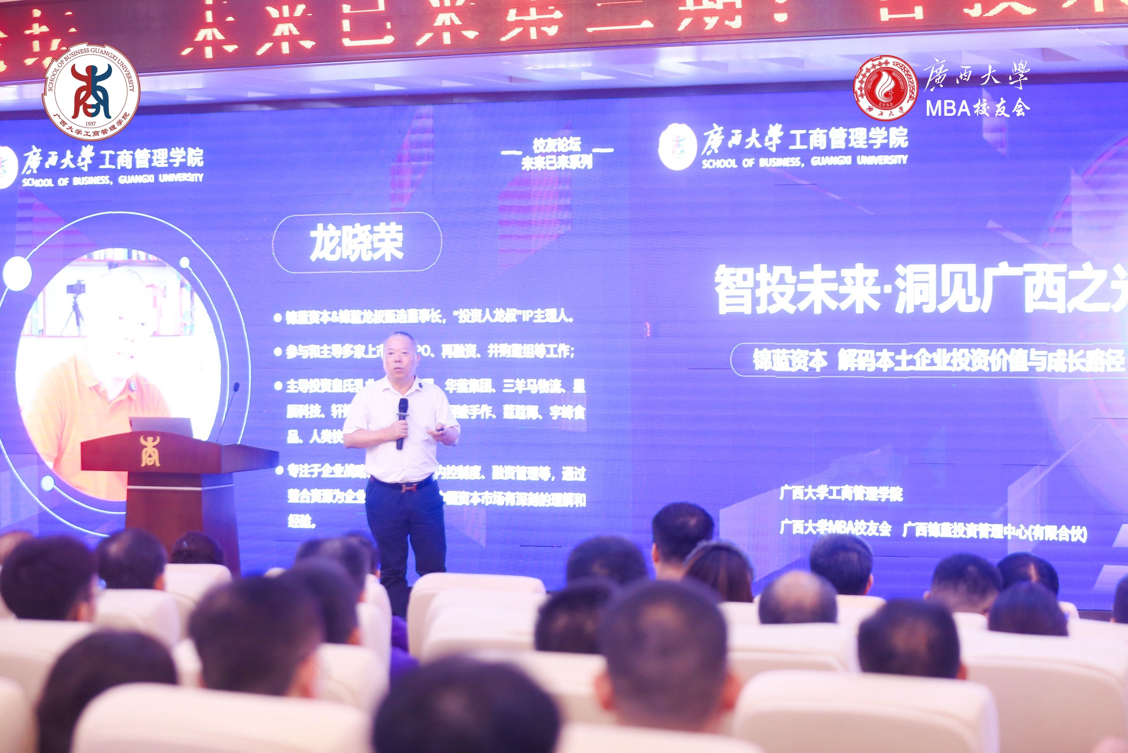 2025年9月21日下午,beat365官方网站128报告厅内高朋满座、思想汇聚,一场聚焦资本赋能与广西产业发展的深度对话在此拉开帷幕。由beat365官方网站与beat365官方网站MBA校友会联合主办的“未来已来”校友论坛第三期——“智投未来・洞见广西之光”,特邀锦蓝资本创始人、“投资人龙叔”IP主理人龙晓荣先生担任主讲嘉宾,与学院师生及校友共探发展机遇。