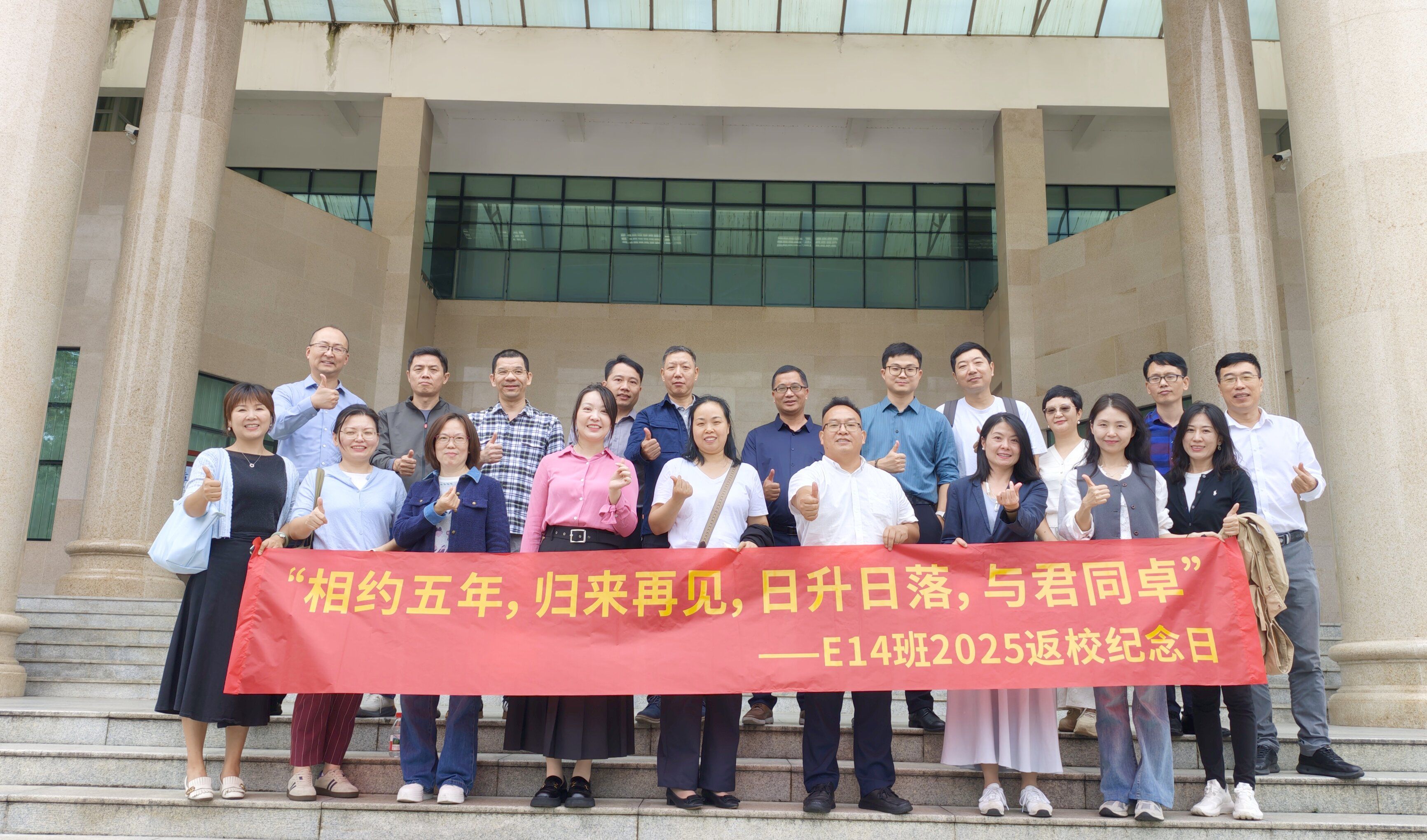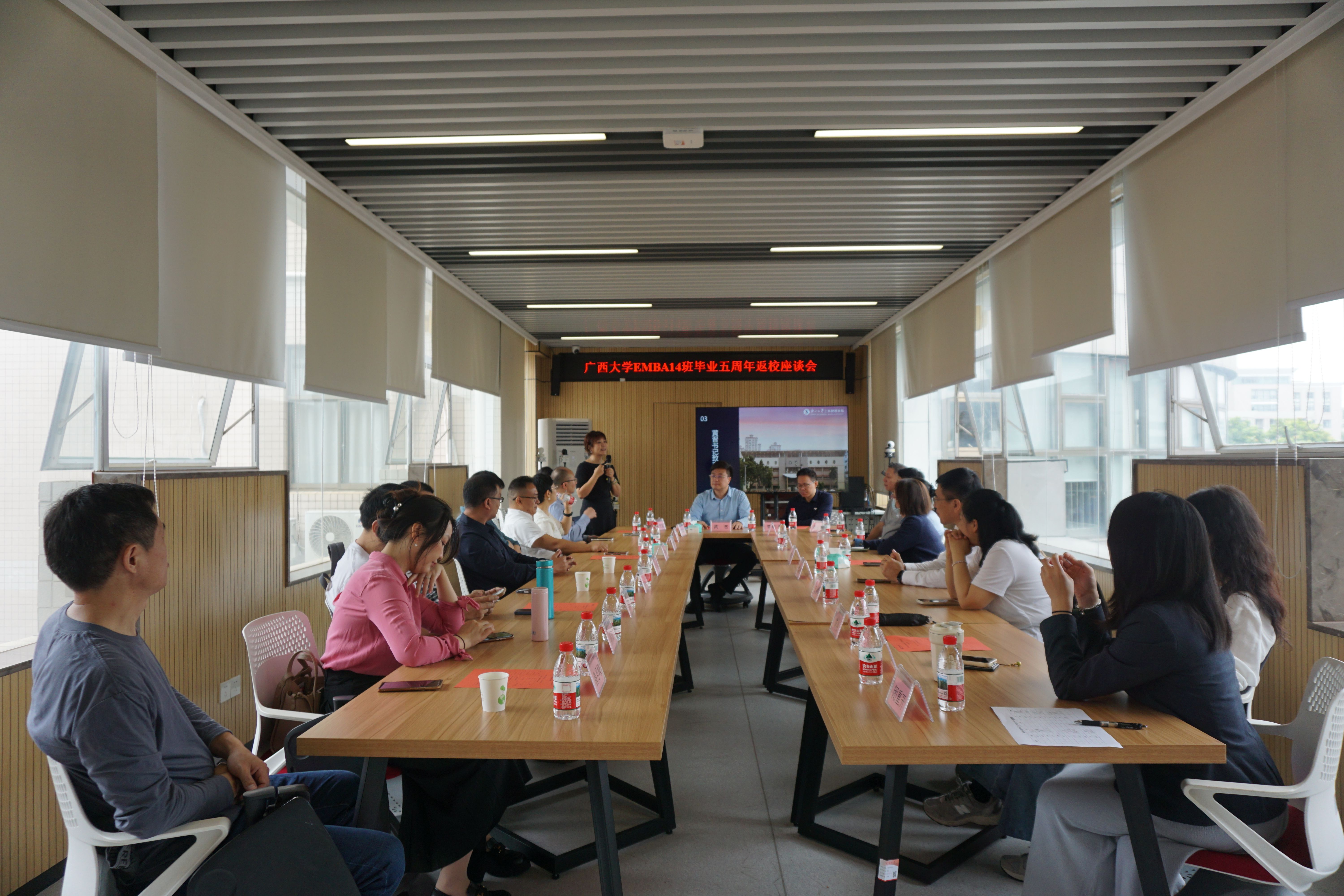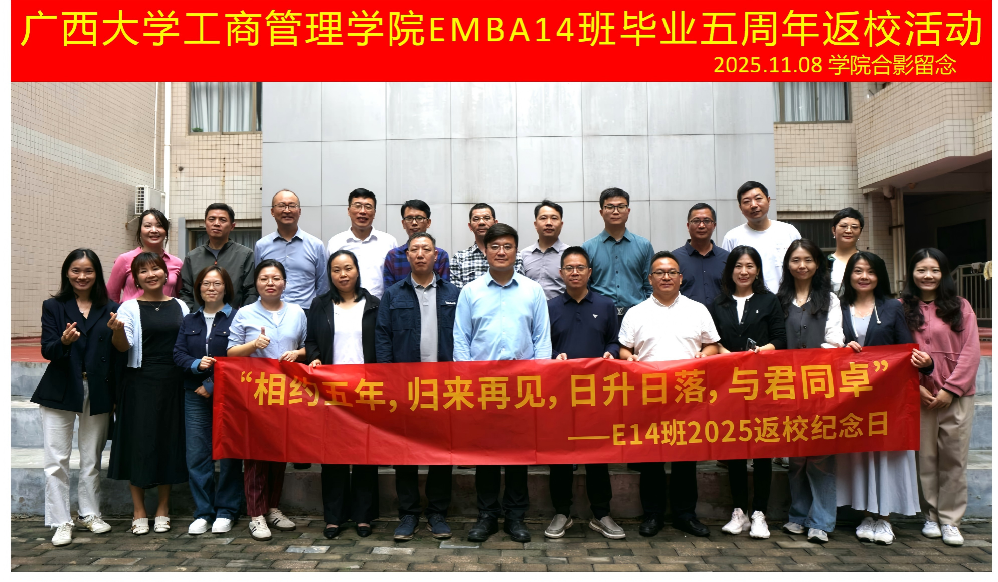 2025年11月8日上午,绿城南宁秋意正浓,beat365官方网站迎来了一批特殊的“家人”—EMBA14班的校友们,在毕业五周年的重要时刻重返母校,共赴一场“重温同窗谊,再启新篇章”的温情聚会。二十余位校友跨越山海,从全国各地奔赴而来,相聚学院500教室,在熟悉的校园中追忆往昔,畅谈当下,共绘未来蓝图。