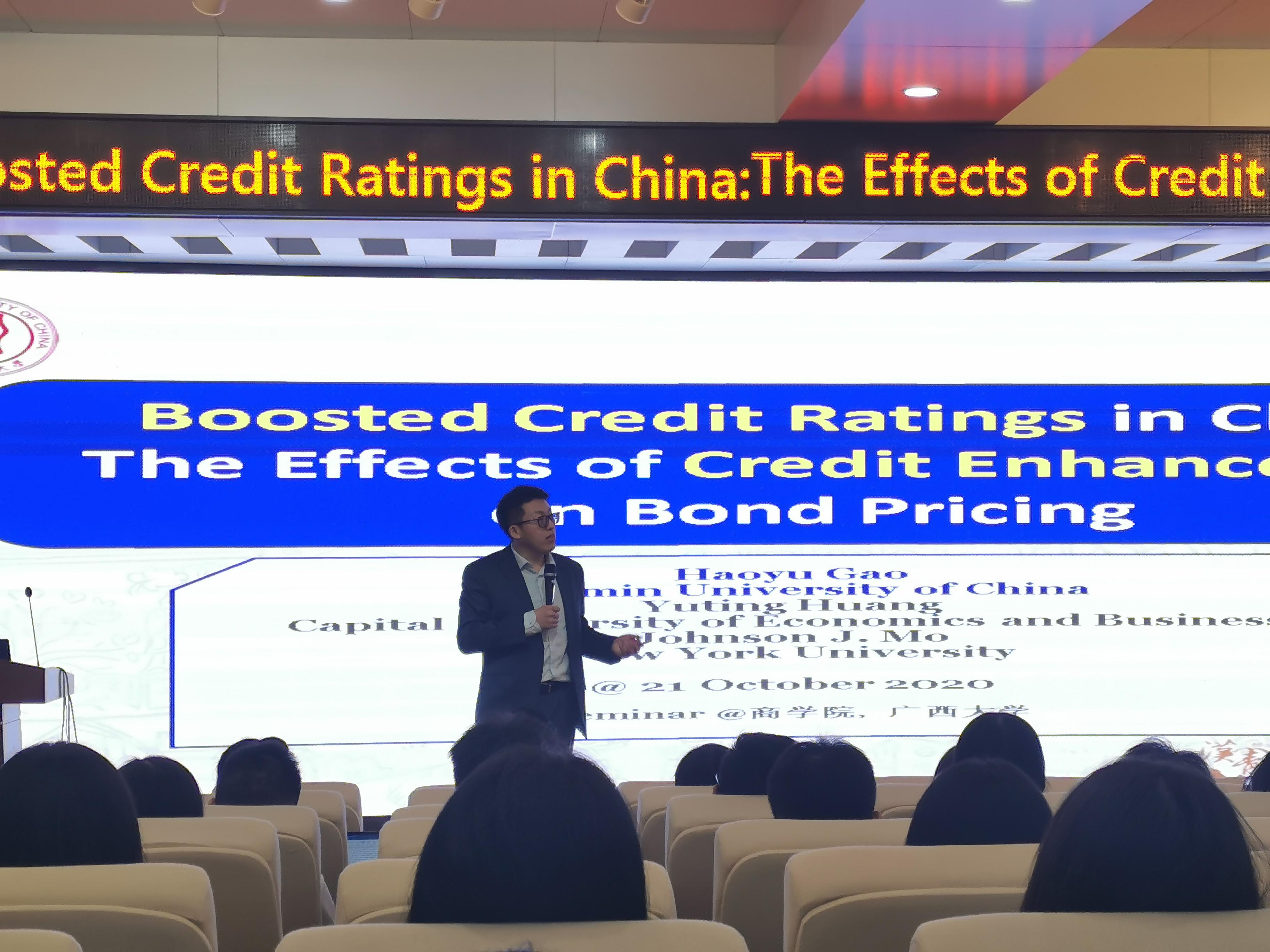 10月21日,中国人民大学汉青经济与金融高级研究院金融系高昊宇副教授应邀来bat365官网进行学术交流,于商学院128报告厅进行了主题为“Boosted Credit Ratings in China: The Effects of Credit Enhancement on Bond Pricing”的学术报告。