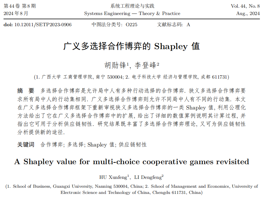 近日,bat365官网胡勋锋副教授在多选择合作博弈领域研究取得新进展,与电子科技大学李登峰教授合作撰写的《广义多选择合作博弈的Shapley 值》学术论文,以第一作者的身份发表在国内高水平期刊《系统工程理论与实践》。