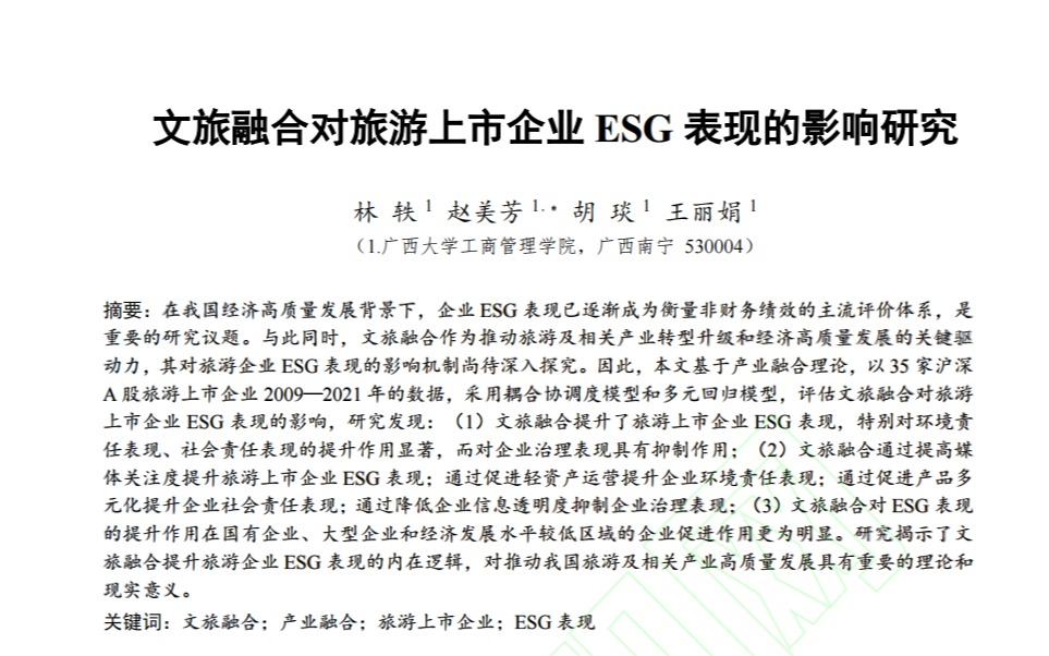 近日,bat365官网林轶教授科研团队在文旅融合与旅游企业ESG表现领域研究取得新进展,研究成果以《文旅融合对旅游上市企业ESG表现的影响研究》为题,在旅游管理领域高水平期刊《旅游科学》上网络首发。林轶为第一作者,硕士研究生赵美芳、胡琰、王丽娟参与研究并共同发表论文,beat365官方网站为第一单位和通讯单位。