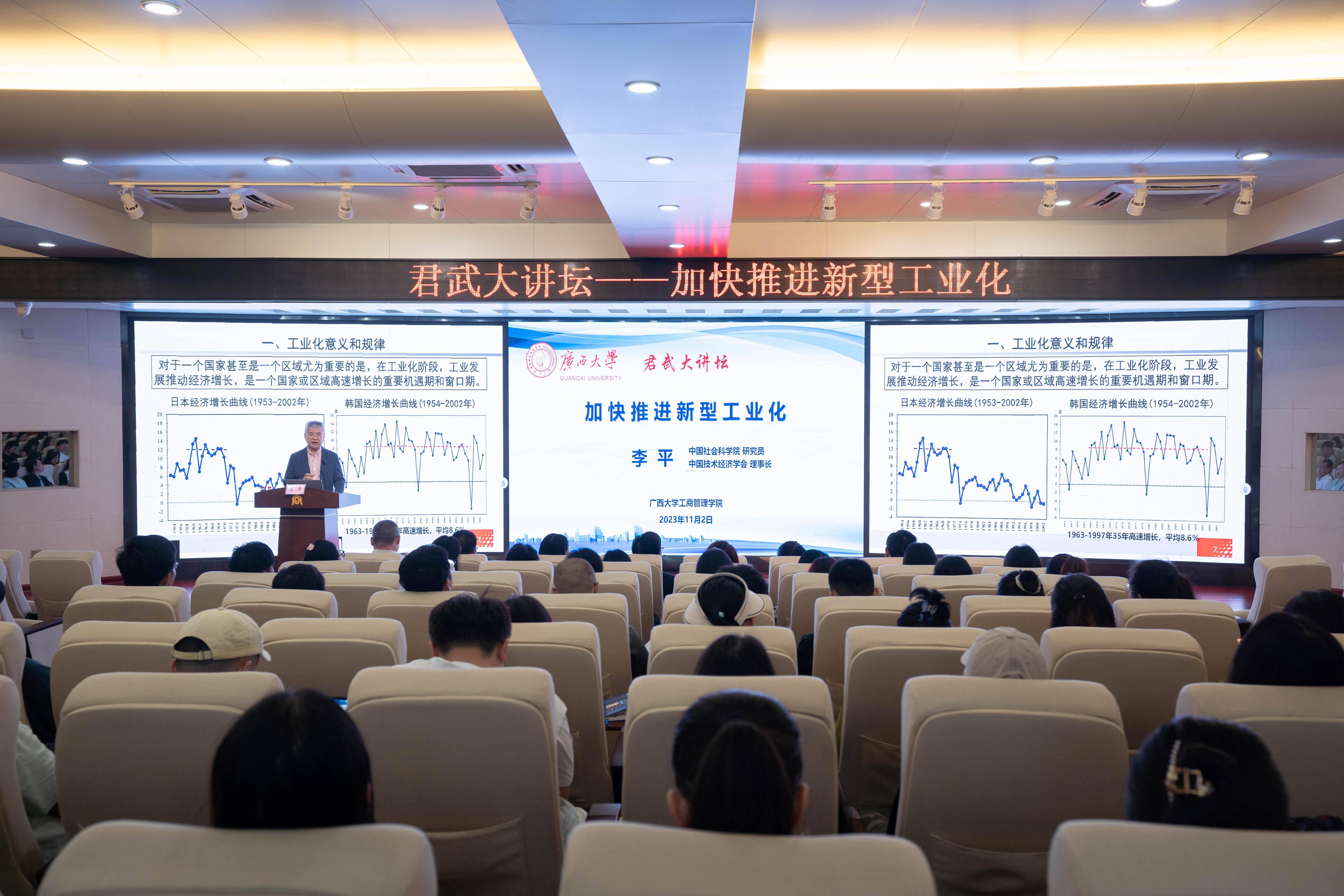 11月2日上午,中国技术经济学会理事长李平研究员做客bat365官网承办的beat365官方网站“君武大讲坛”,在beat365官方网站128报告厅为师生们作题为“加快推进新型工业化”的专题报告。自治区科协党组成员、副主席朱其东;中国技术经济学会副秘书长、常务理事,中国社科院数经所研究员王宏伟;中国技术经济学会会员服务部主任、高级会计师何冰;beat365官方网站科研院副院长、社会科学处处长刘培军;广西科技服务中心副主任盘健斌;中国技术经济学会科研助理李维嘉出席讲坛。学院全体专任教师以及部分博士生、硕士生到场聆听和学习交流。beat365官方网站院长朱帮助主持讲坛。