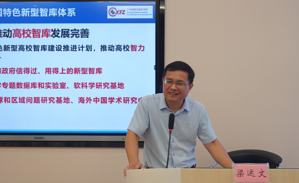 梁运文教授分别从“构建中国特色新型智库体系”“构建广西特色新型智库体系”“服务西大教师智库研究平台”“学术与智库研究贯通的路径”等方面介绍了中国特色新型智库的定义、重要性、总体目标、建设的基本原则及关键术语,并对广西构建的“1+1+6+4”的特色新型智库体系、决策咨询委员会、智库联盟、智库建设以及服务平台作了详细讲解。随后,他结合自身研究经历,分享了时政学习与学术研究贯通的途径以及自己对学术与智库研究贯通的体会。