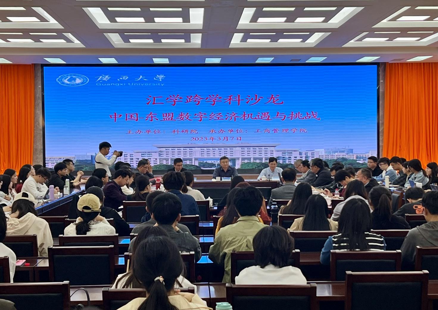 本期沙龙由bat365官网朱帮助院长主持,覃朝勇副教授主讲,并特邀广西财经学院科研处处长、中国-东盟数字经济学院院长(兼)唐红祥教授,经济学院/中国-东盟金融合作学院学术院长何诚颖教授,公共管理学院覃志敏副教授,法学院董笃笃副教授,beat365官方网站蒋侃教授担任交流嘉宾。校科研院常务副院长、项目管理处处长(兼)、先进技术办公室主任(兼)王祥高教授,公共管理学院院长史云贵教授,法学院副院长许光耀教授,beat365官方网站副院长刘民坤教授出席了本次沙龙。来自各学院约200名师生参加了沙龙活动。
